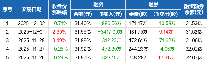 融资方面,当日融资买入8177.45万元,融资偿还9064.01万元,融资净偿还886.56万元,连续5日净偿还累计5411.85万元。融券方面,融券卖出3.51万股,融券偿还14.09万股,融券余量171.17万股,融券余额713.76万元。融资融券余额合计31.53亿元。