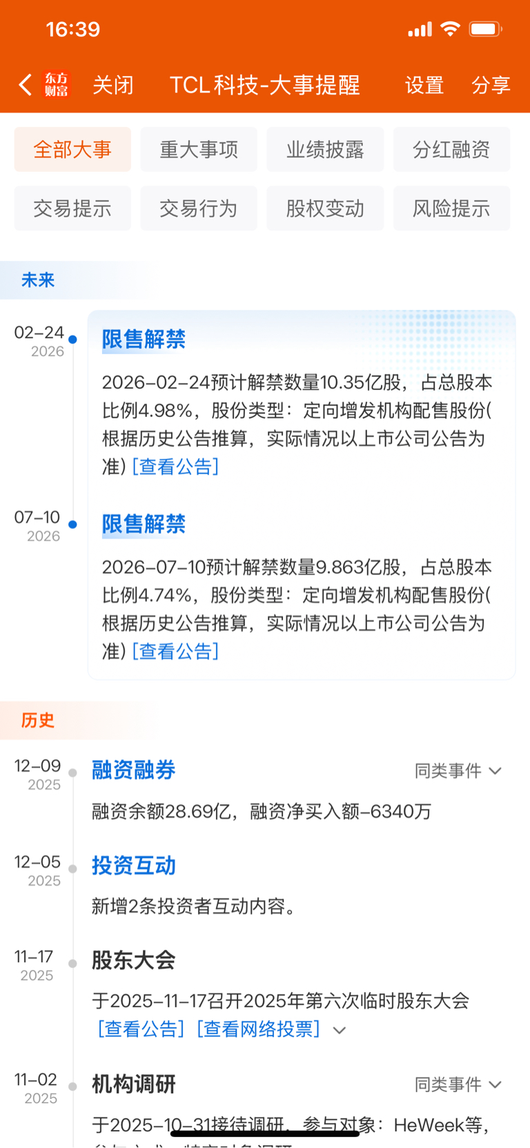 $TCL科技(SZ000100)$ 限售股解禁,注意风险。