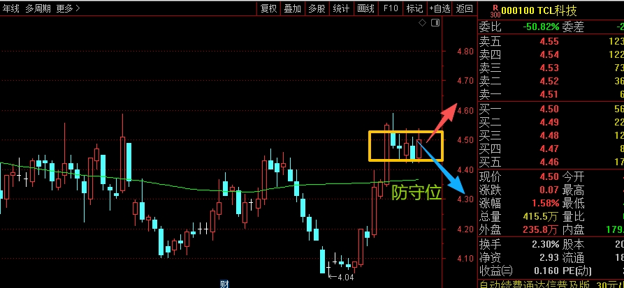 $TCL科技(SZ000100)$ 近期反弹走势比较强,这几天主要是做一个高位的横盘整理,形成了一个震荡箱体,接下来重点就盯着箱体的得失即可,能带量突破站稳就漂亮了,继续打开上涨空间,但如果突破未遂,就要防着回落风险了,底部绿色大均线4.37作为防守位应对,有效跌破就要注意控制仓位,不用纠结。