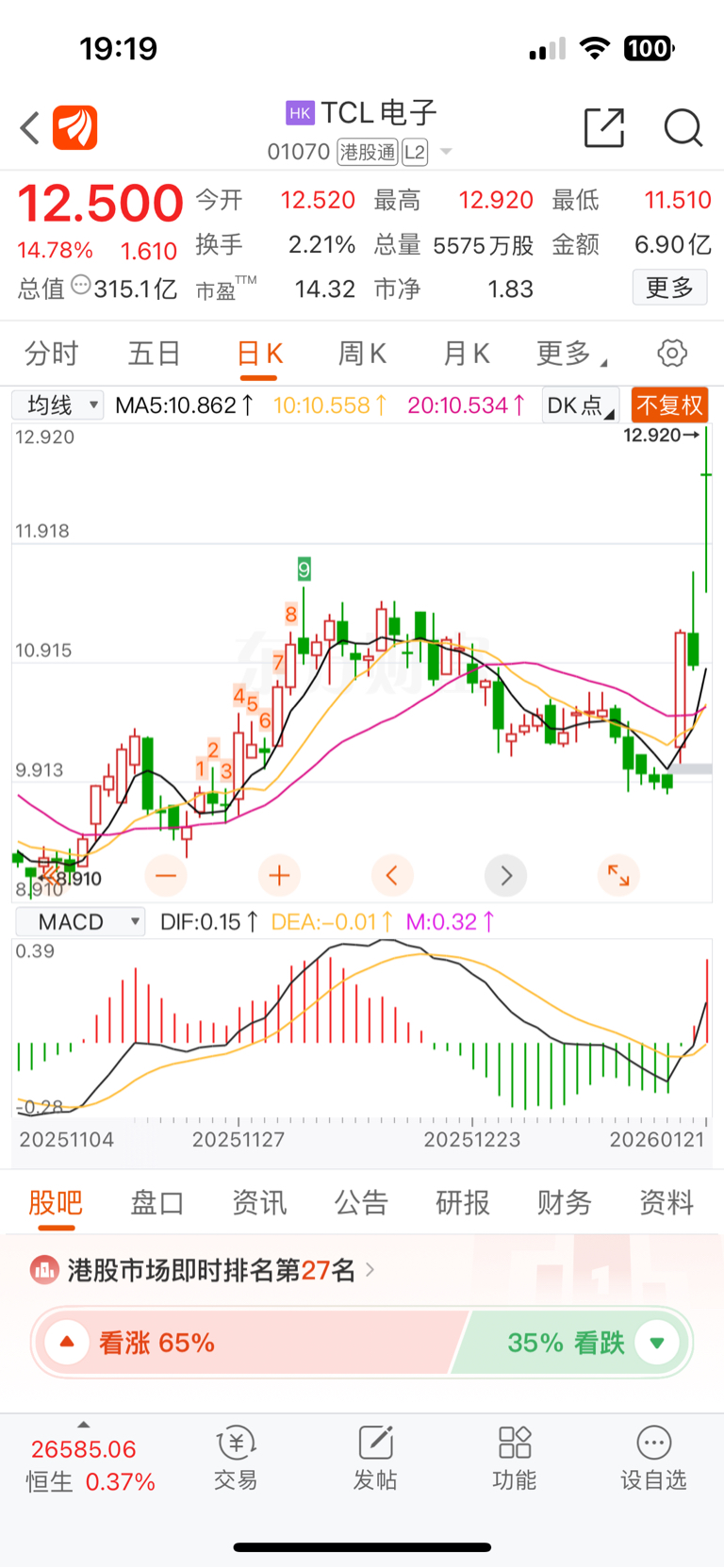 $TCL科技(SZ000100)$ 本来不想告诉你们,让你们看一看,今天香港的TCL涨了18个点