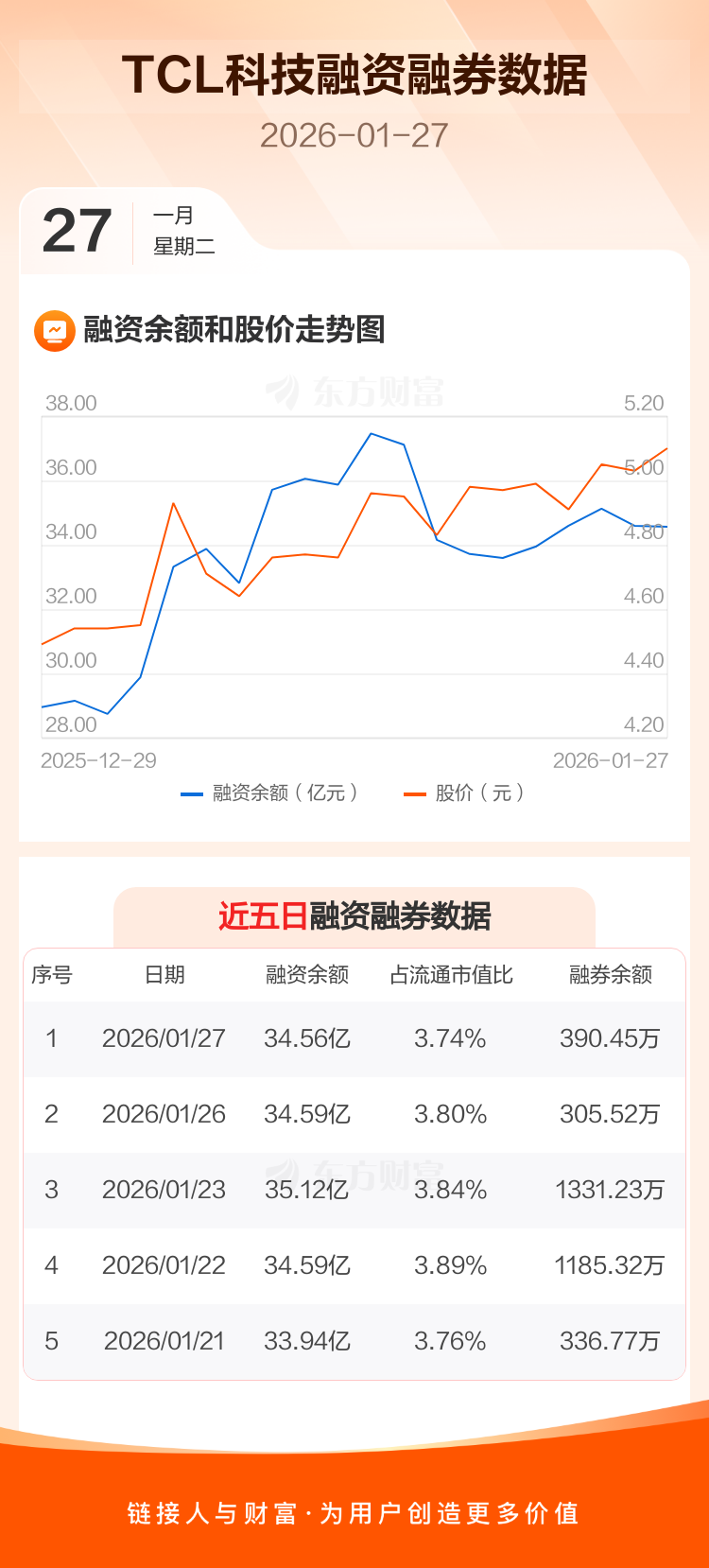 交易所最新数据显示,TCL科技于2026年1月27日获融资买入3.97亿元,融资偿还3.99亿元,当日融资净偿还283.94万元。目前,该股融资余额34.56亿,占流通市值比例为3.74%。