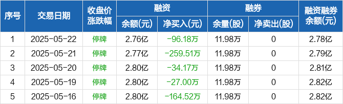 融资方面,当日融资买入0元,融资偿还96.18万元,融资净偿还96.18万元,连续5日净偿还累计581.39万元。融券方面,融券卖出0股,融券偿还0股,融券余量11.98万股,融券余额171.43万元。融资融券余额合计2.78亿元。