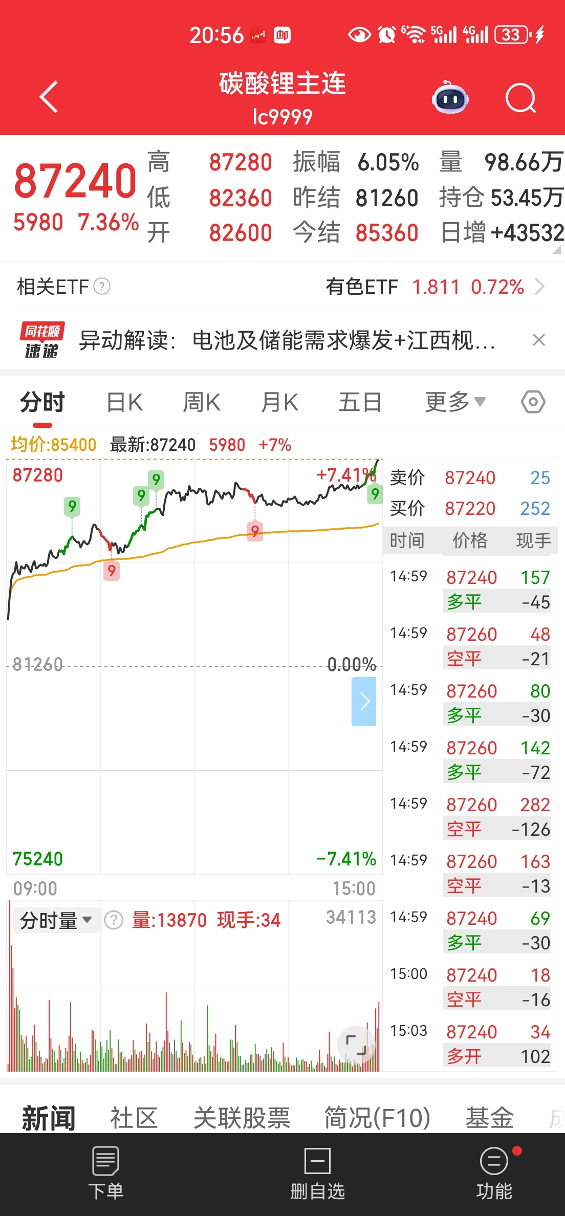 碳酸锂期货价格涨了7.36%。。。明天应该高开了吧?