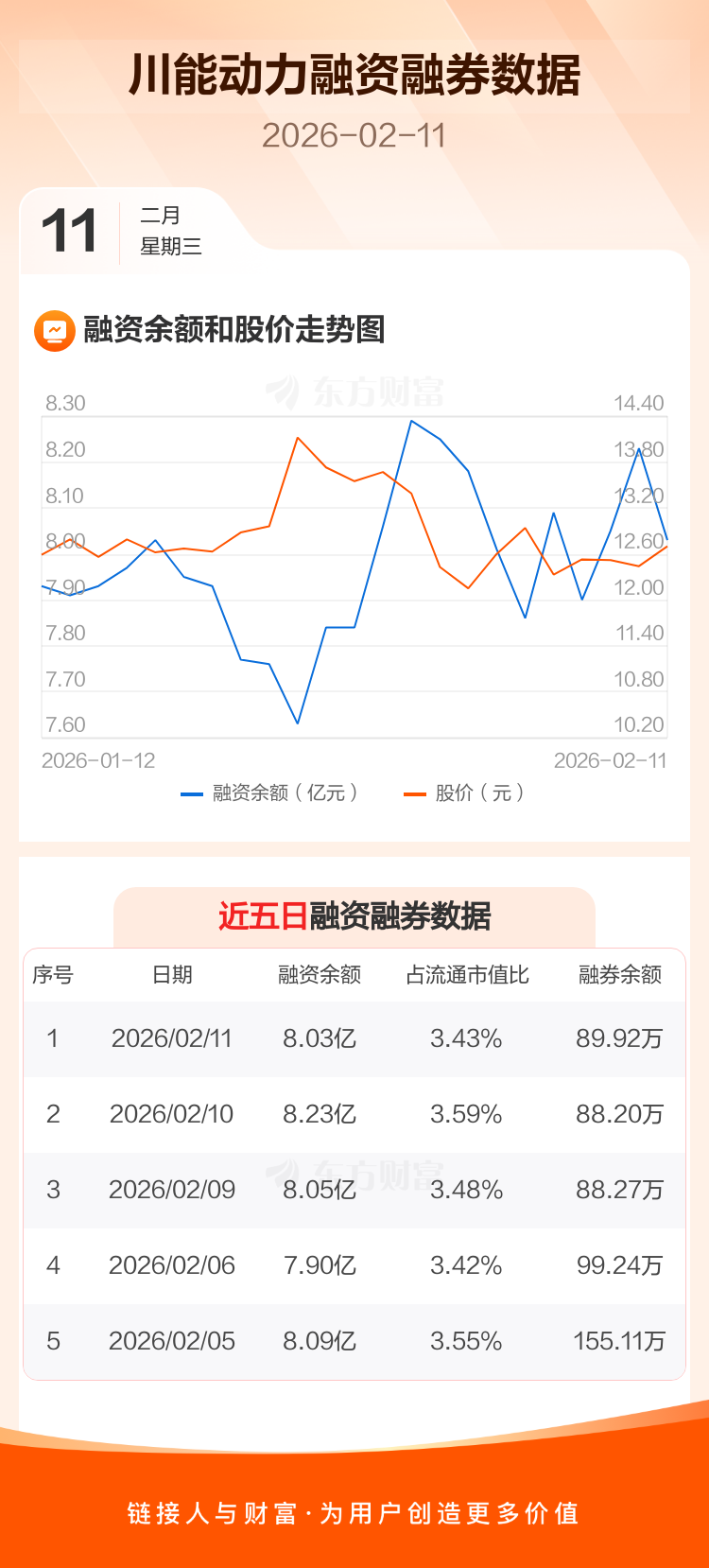 交易所最新数据显示,川能动力于2026年2月11日获融资买入3704.91万元,融资偿还5707.51万元,当日融资净偿还2002.6万元。目前,该股融资余额8.03亿,占流通市值比例为3.43%。