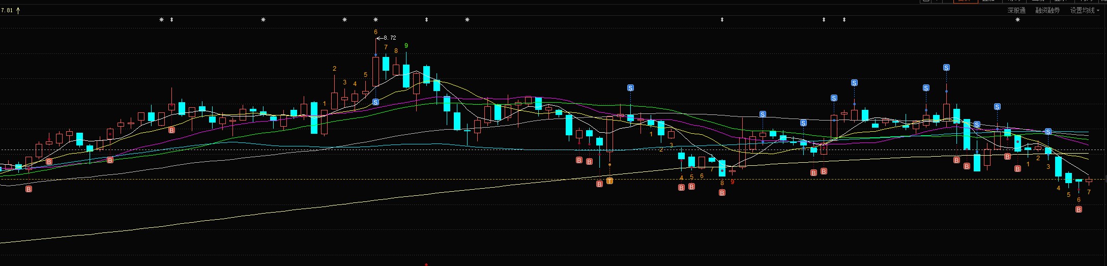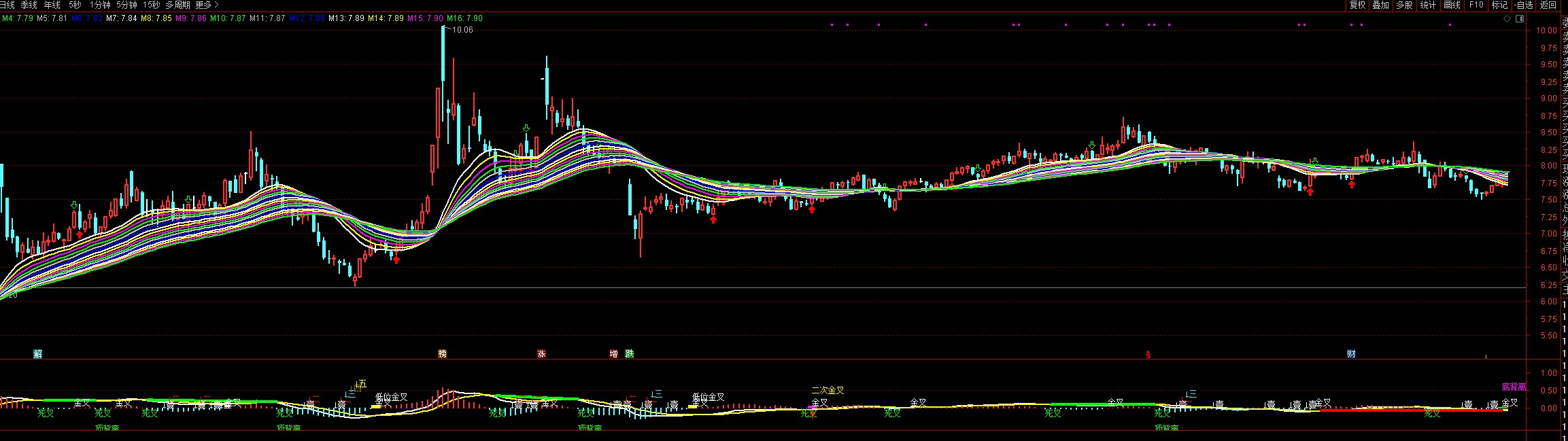 日线四次顶背离,近期会形成底背离,形成正反盖。月线,季线,半年线都形成了底背离,明年45日线会有一轮砸盘,最终形成45日线底背离,明年收盘在13.45元以上,形成年线底背离。现在买入明年确定可以翻倍,但是不排除明年年初破7元做45日线底背离。