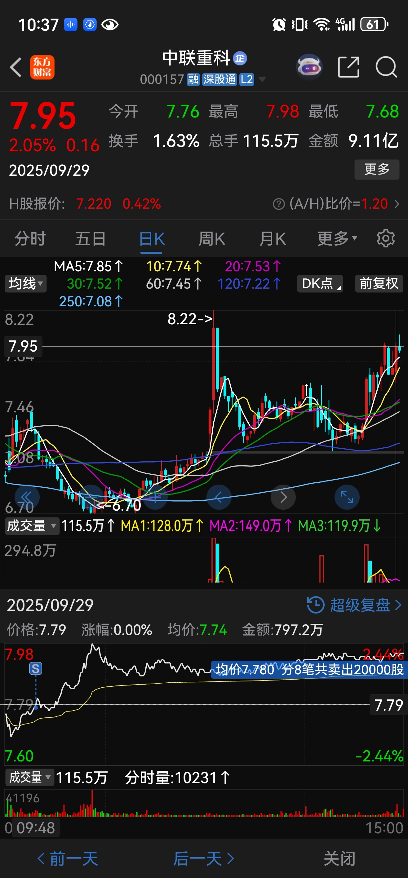 $中联重科(SZ000157)$ 上不去就下来吧,刚好我昨天7.78T飞了两万股想接回来,要求不高7.77交个朋友