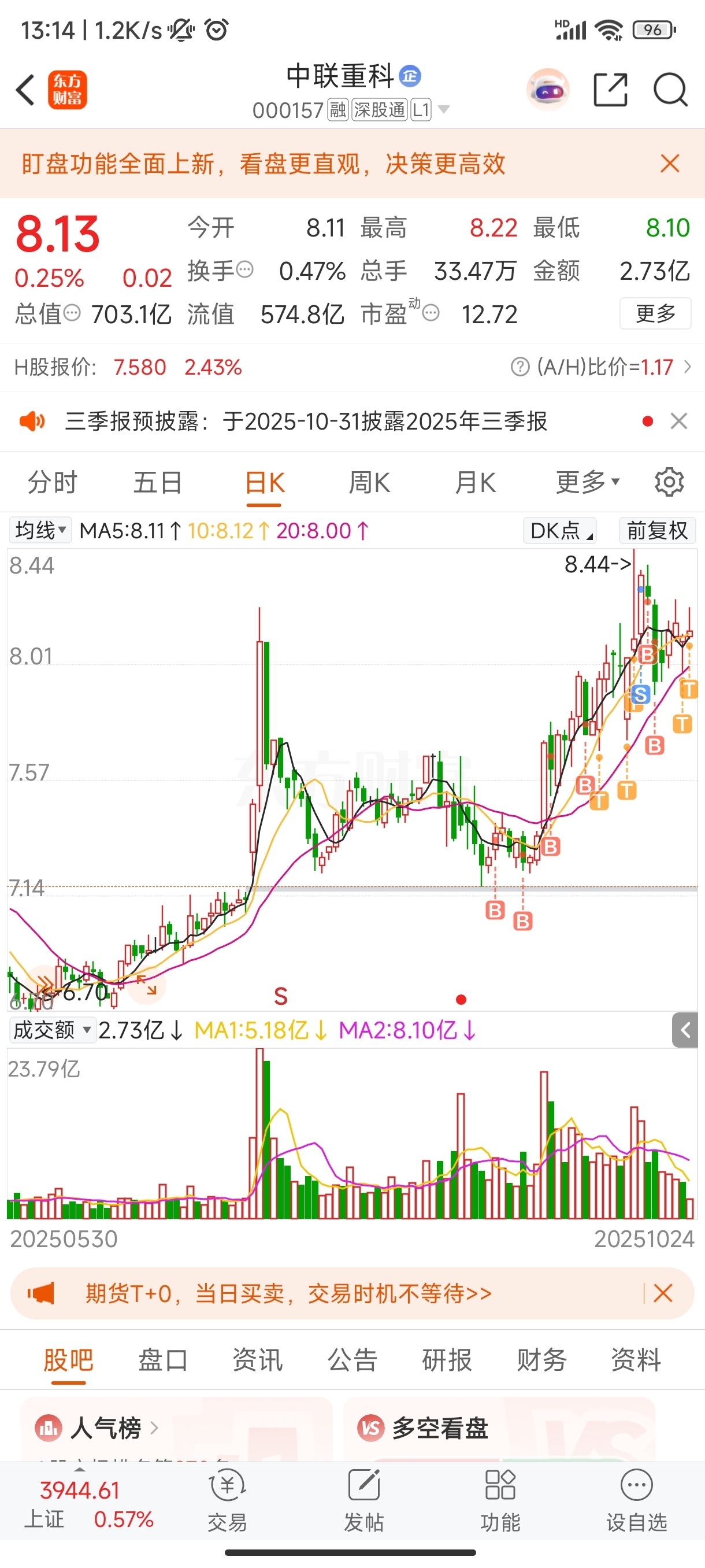 $中联重科(SZ000157)$ 百分之60的仓位,一直来回做T,总体趋势是向上的,而且比较稳,不容易受大波动影响操作心态