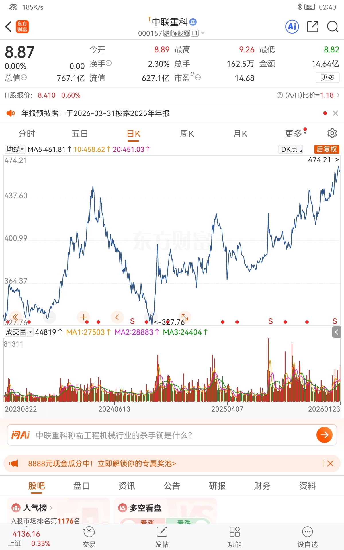$中联重科(SZ000157)$ 后复权已经破前高,拿稳就行,15元才是我的目标价