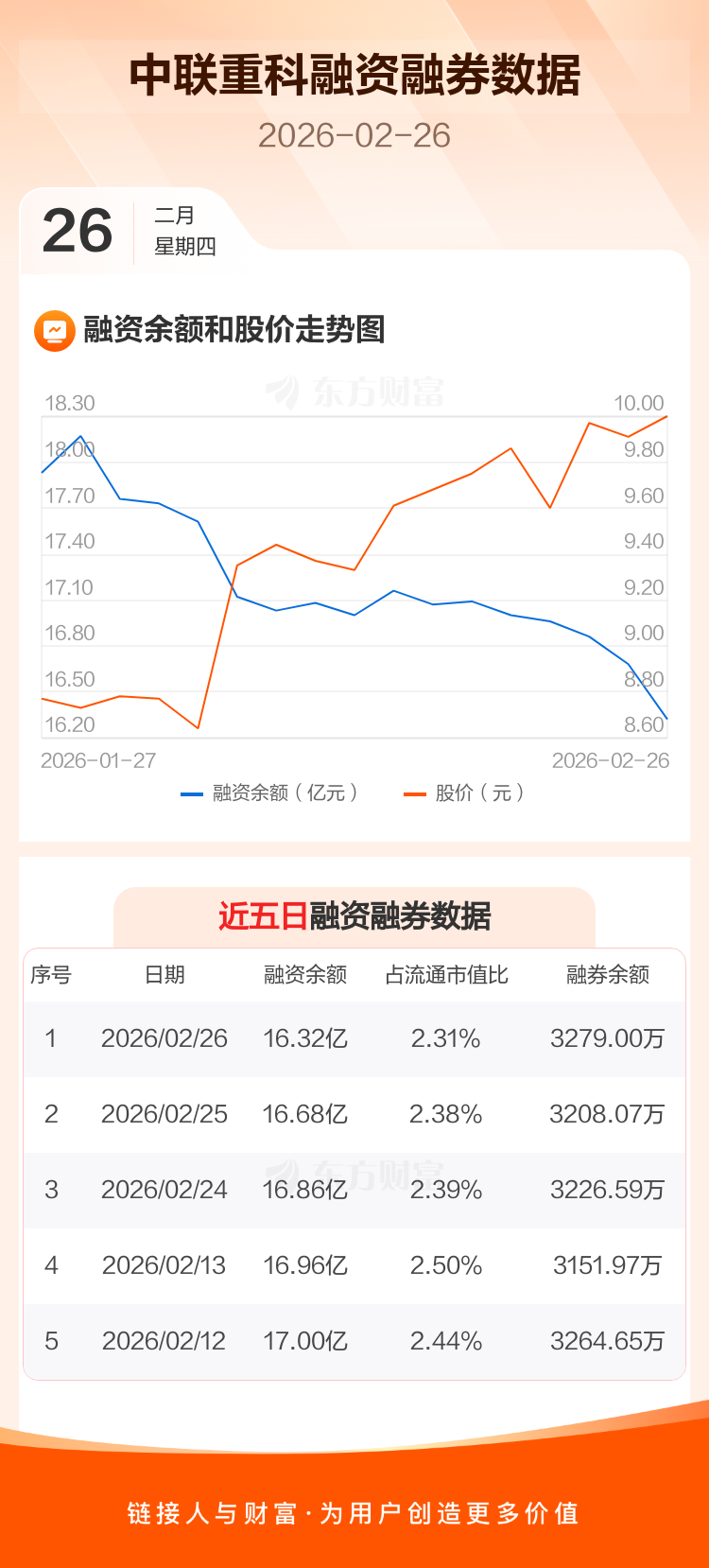 交易所最新数据显示,中联重科于2026年2月26日获融资买入5387.57万元,融资偿还8967.78万元,当日融资净偿还3580.21万元。目前,该股融资余额16.32亿,占流通市值比例为2.31%。