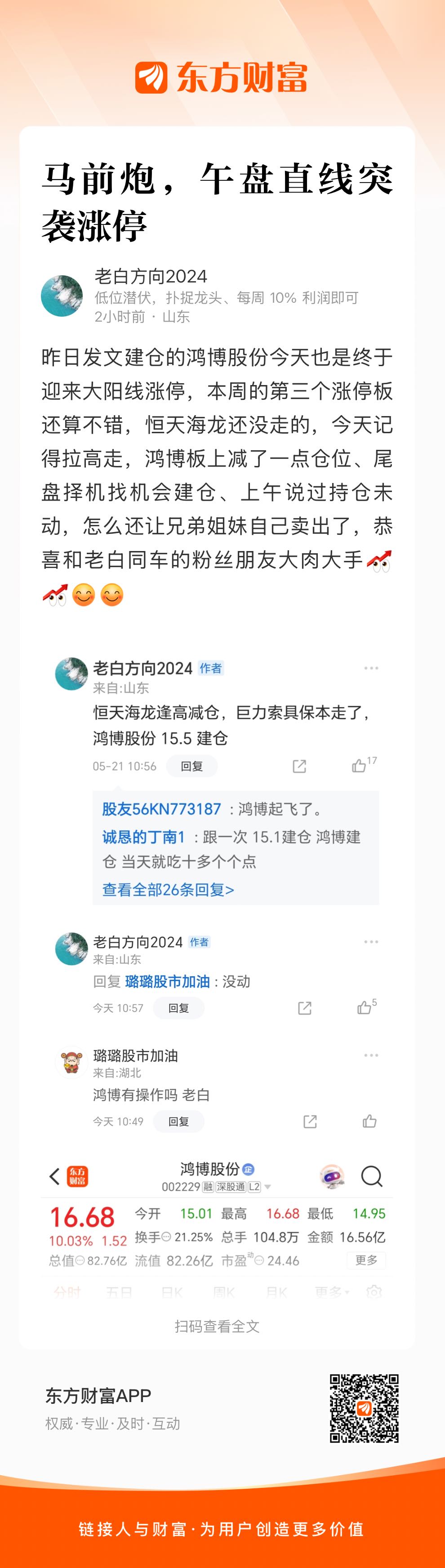 昨日发文建仓的鸿博股份今天也是终于迎来大阳线涨停,本周的第三个涨停板还算不错,恒天海龙还没走的,今天记得拉高走,鸿博板上减了一点仓位、尾盘择机找机会建仓、上午说过持仓未动,怎么还让兄弟姐妹自己卖出了,恭喜和老白同车的粉丝朋友大肉大手