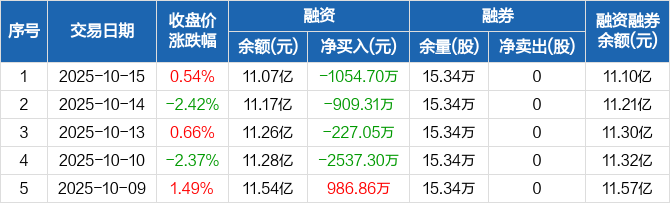 融资方面,当日融资买入3631.24万元,融资偿还4685.94万元,融资净偿还1054.7万元,连续4日净偿还累计4728.37万元。融券方面,融券卖出0股,融券偿还0股,融券余量15.34万股,融券余额342.7万元。融资融券余额合计11.1亿元。