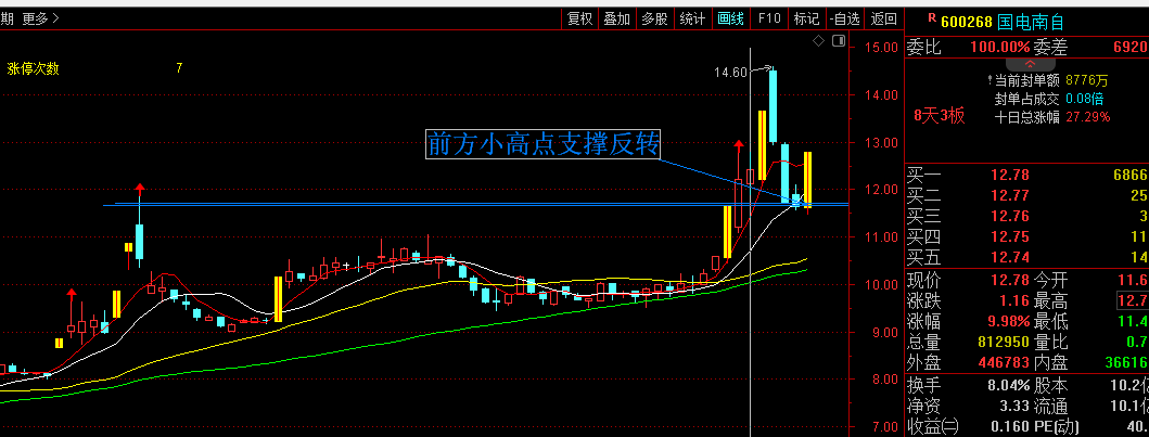 深地经济 国电南自有多个近期热门板块概念,岩土工程检测,核电,巡检机器人,雅下水电站等,昨天爆发的深土经济也能有一定关联。不过引起欧阳关注这支票的原因还是技术上的走势。从图表上看,12元是前方的一个小高点,10.13突破小高点后,三天时间,涨到14.8,大阴线回落,连续下跌三天。正常情况下很多战友就已经把这只票抛弃 了,但是看这只票下跌缩量,昨日止跌在前方小高点位置,今天借着深地经济利好直接起飞,发起二波。欧阳认为如果明天这只票低开不掉,会是很好 介入时机。