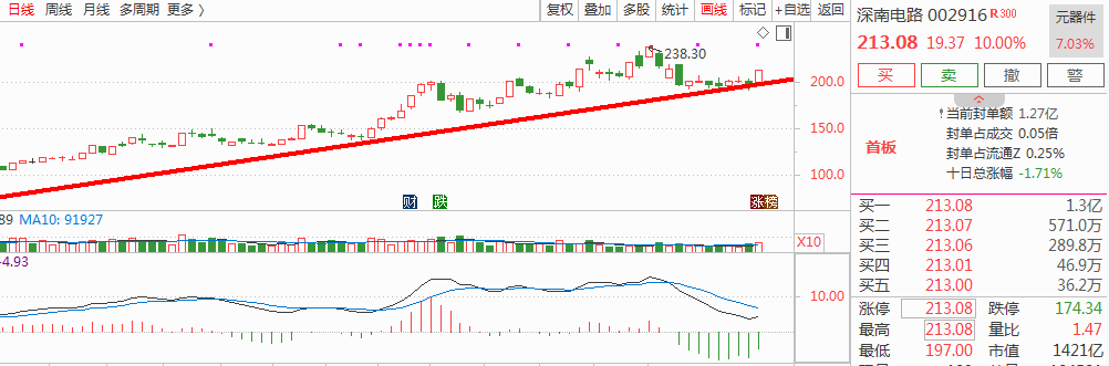 存储芯片概念,周五这个板块10只涨停,其中4只是20CM标的,可见炙手可热的程度。深南电路无论是从形态还是涨停的时间来看,都不是最鲜明的那只,但却有一个最大的亮点,龙虎上显示,买5全是一线柚子,其中四家是机够,这个放在整个市场都是独一无二的存在,在低位首板出现这样的情况补涨的概率非常大。深南电路是中国航空工业集团旗下,印制电路板行业全球前十,中国封装基板领域的先行者,与长江存储、三星等存储巨头展开合作,是三星存储工厂的核心供应商之一,其存储类封装基板全球市占率超 12%,在存储芯片产业链中占据重要地位。随着全球存储芯片市场的回暖,预计第四季度 DRAM 报价将大幅上涨。尽管不像江波龙、现弄芯创等创新高,但是深南电路整体却是处于上行通道,目前已经把5日、10日、20日均线踩在脚下,配合榜上如此豪华数据,今天应该还有高溢价,但如果高开太多而低走则要等二次修复。