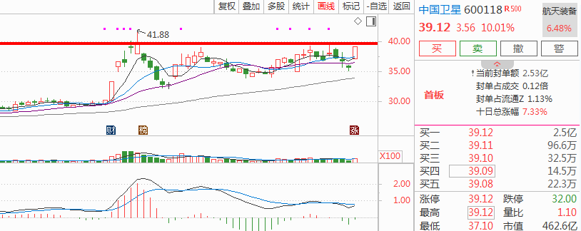 低空经济+卫星导航属性,也具有央企跟军工背景,四Z全会公报发布,相较于十九届五Z全会公报,本次公报新增了航天强国。公司专注于宇航制造与卫星应用两大主业,是目前A股唯一具备完整小卫星/微小卫星型谱的制造企业,正密集参与千帆、星网等低轨互联网星座建设。此次时隔7个月,千帆星座第六批组网卫星再度成功发射或标志着千帆星座大规模组网工作的重启,有望带动相关产业链全面发展。公司积极参与低空经济建设与发展,以基于北斗的“卫星应用 低空经济”为切入点,适用于商用飞机搭载的机载多模导航接收机项目完成验收与地面集成测试,无人值守无人机等产品实现多场景应用和批量交付。尽管周五涨停,但也还处于箱体震荡结构当中,但细观这个过程,中间仅有9月8日一个涨停板,之后股价还是震荡上行,所以今天如果高开走在,分时走稳才有望复制,低开低走收阴则等反包。