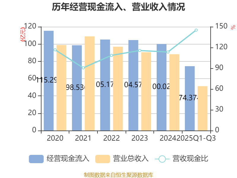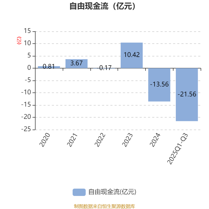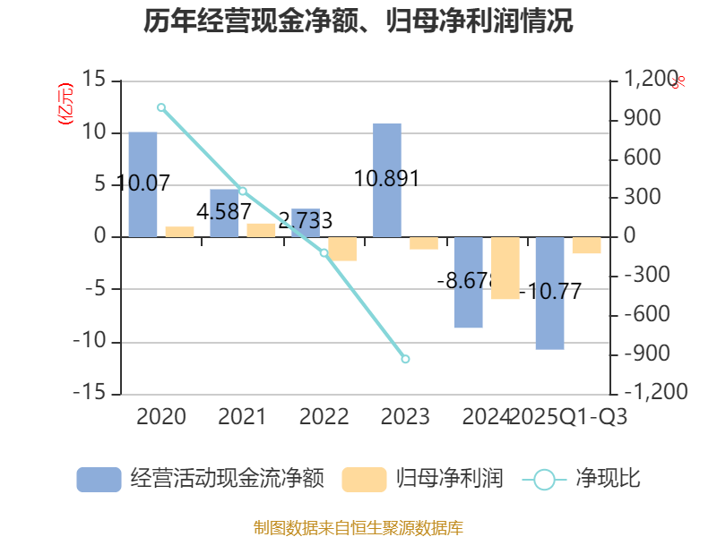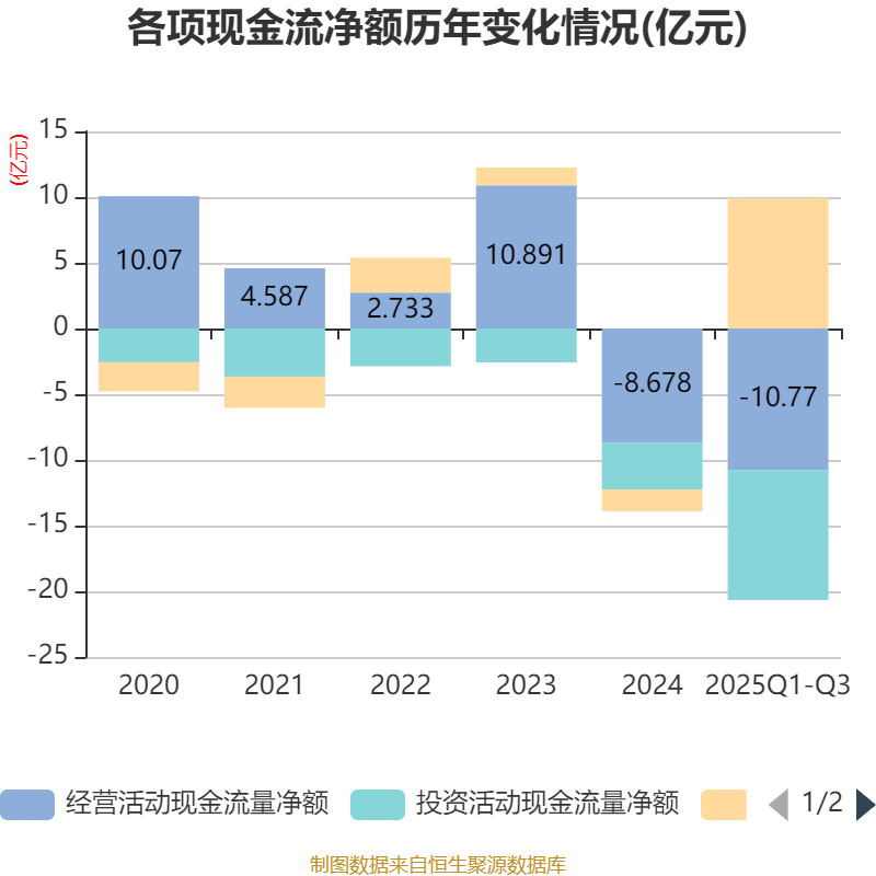 2025年前三季度,公司经营活动现金流净额为-10.77亿元,同比增加3.74亿元;筹资活动现金流净额9.92亿元,同比增加15.01亿元;投资活动现金流净额-9.9亿元,上年同期为-1.7亿元。