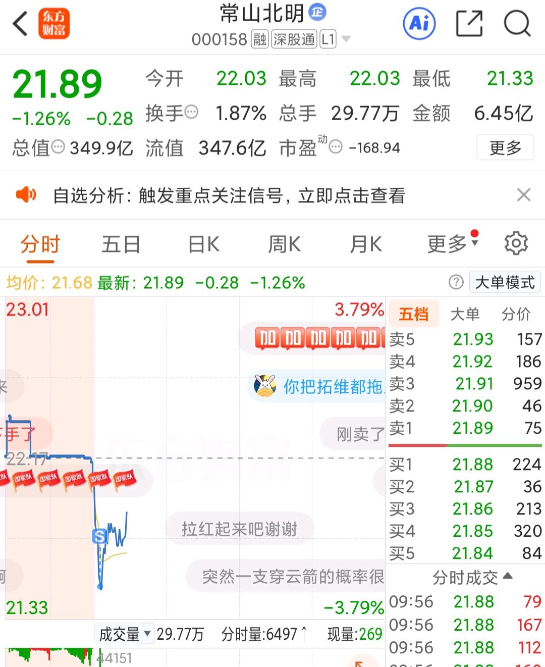 $常山北明(SZ000158)$ 主力盯着我一个人杀吗?上星期四早上追进来,星期五开盘跌停,只能出了,昨天红着又买回来,想着今天只要不跌三个点就拿着,偏偏跌到三个点,一卖又拉?就盯着我这几万块钱杀?