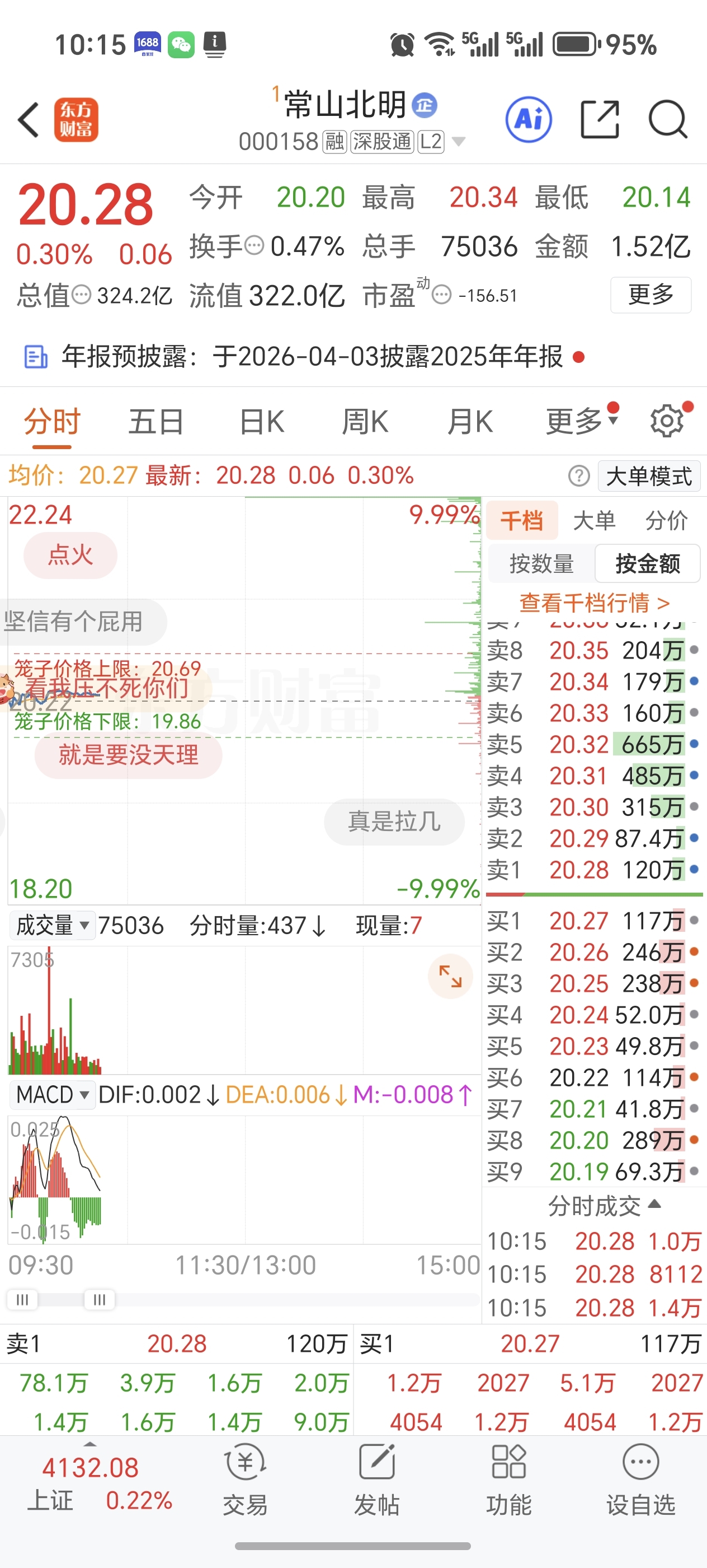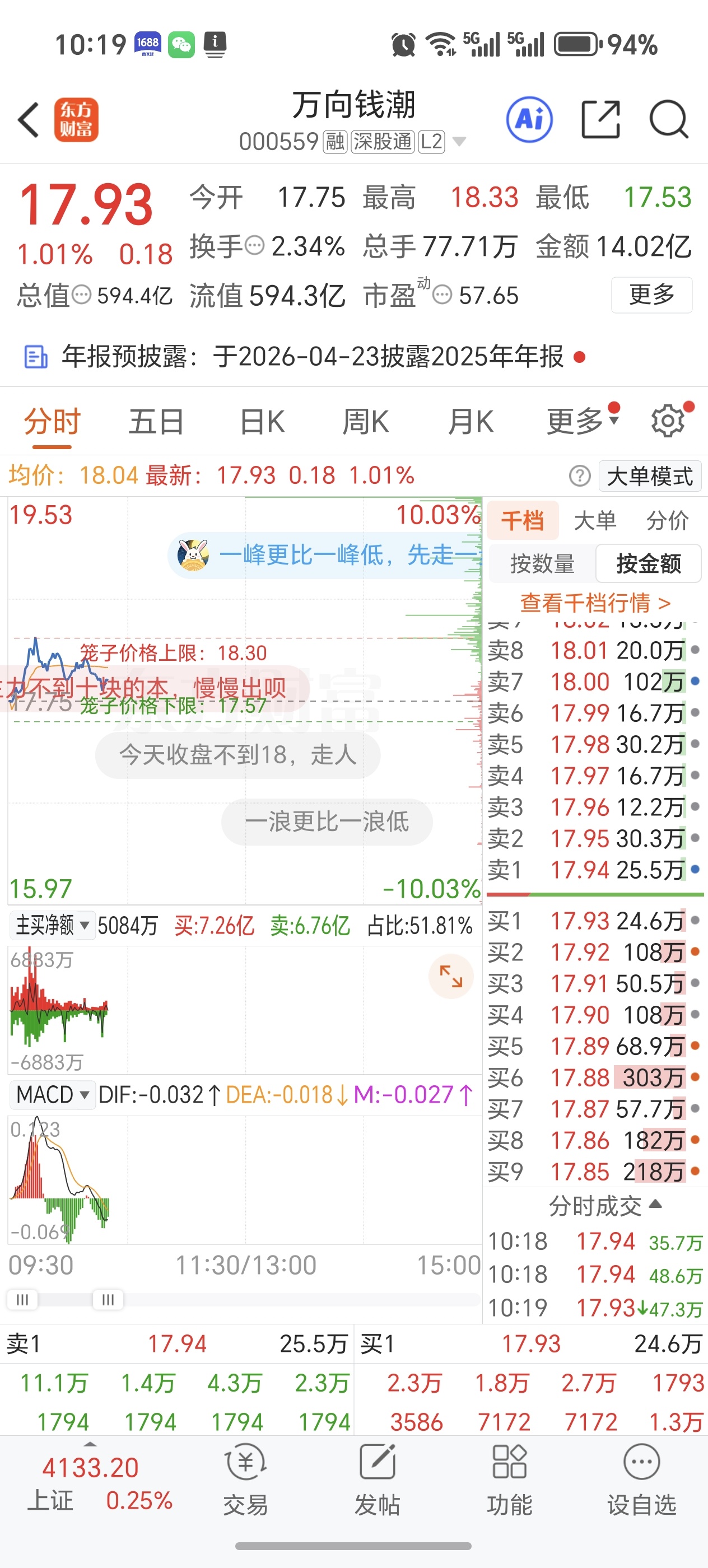 市值不如万向钱潮,区区一分,挂了一千万卖单,一分钱卖单顶万向钱潮卖一天了