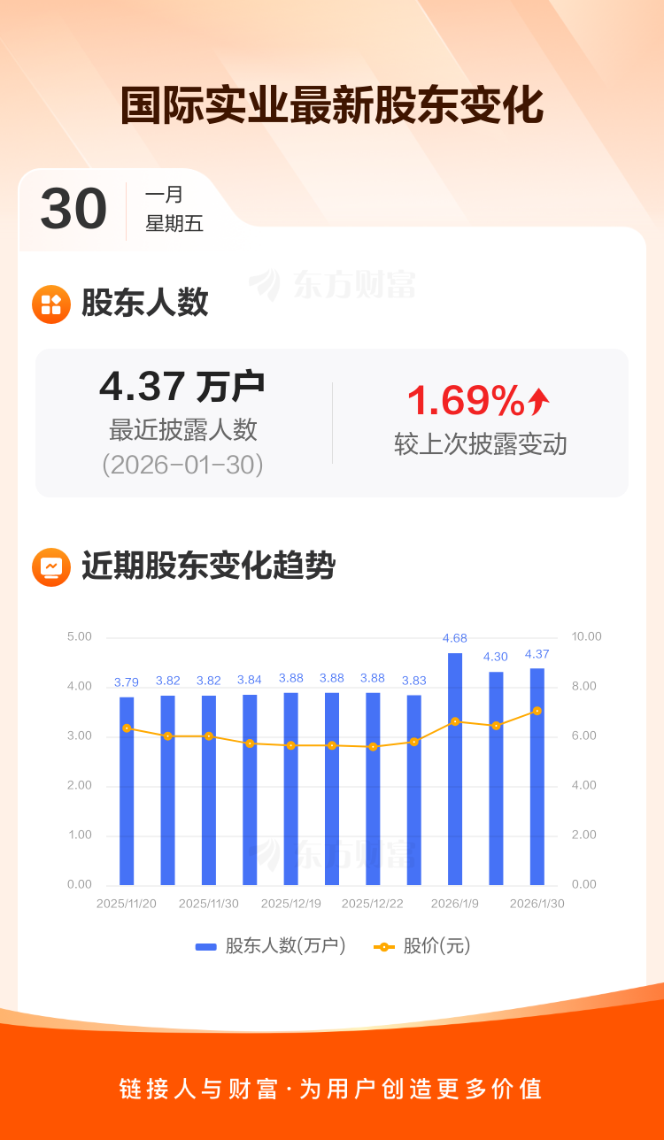 国际实业:截至1月30日最新股东户数4.37万户,较上期增加1.69%