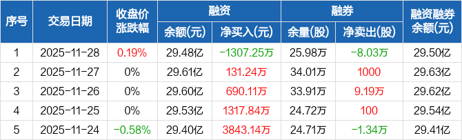 申万宏源:融资净偿还1307.25万元,融资余额29.48亿元(11-28)