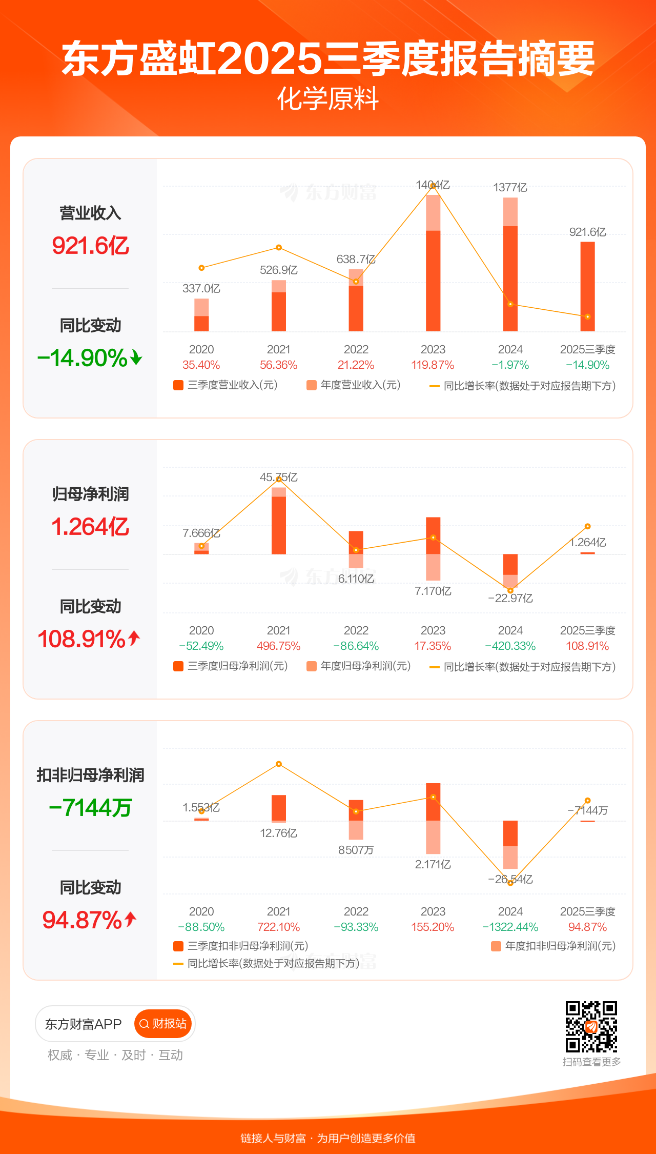 东方盛虹10月31日发布2025年三季报显示,公司前三季实现营业收入921.62亿元,同比下滑14.90%;归母净利润1.26亿元,同比增长108.91%;扣非归母净利润-7143.65万元。
