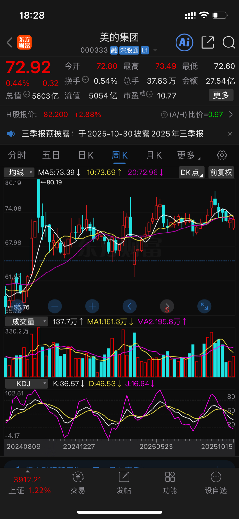 $美的集团(SZ000333)$ 经过多次做t,以及由35手减仓到15手,目前成本降到65.4块,这是一个安全且不需要再做t的价格了。准备到目标76块卖出。