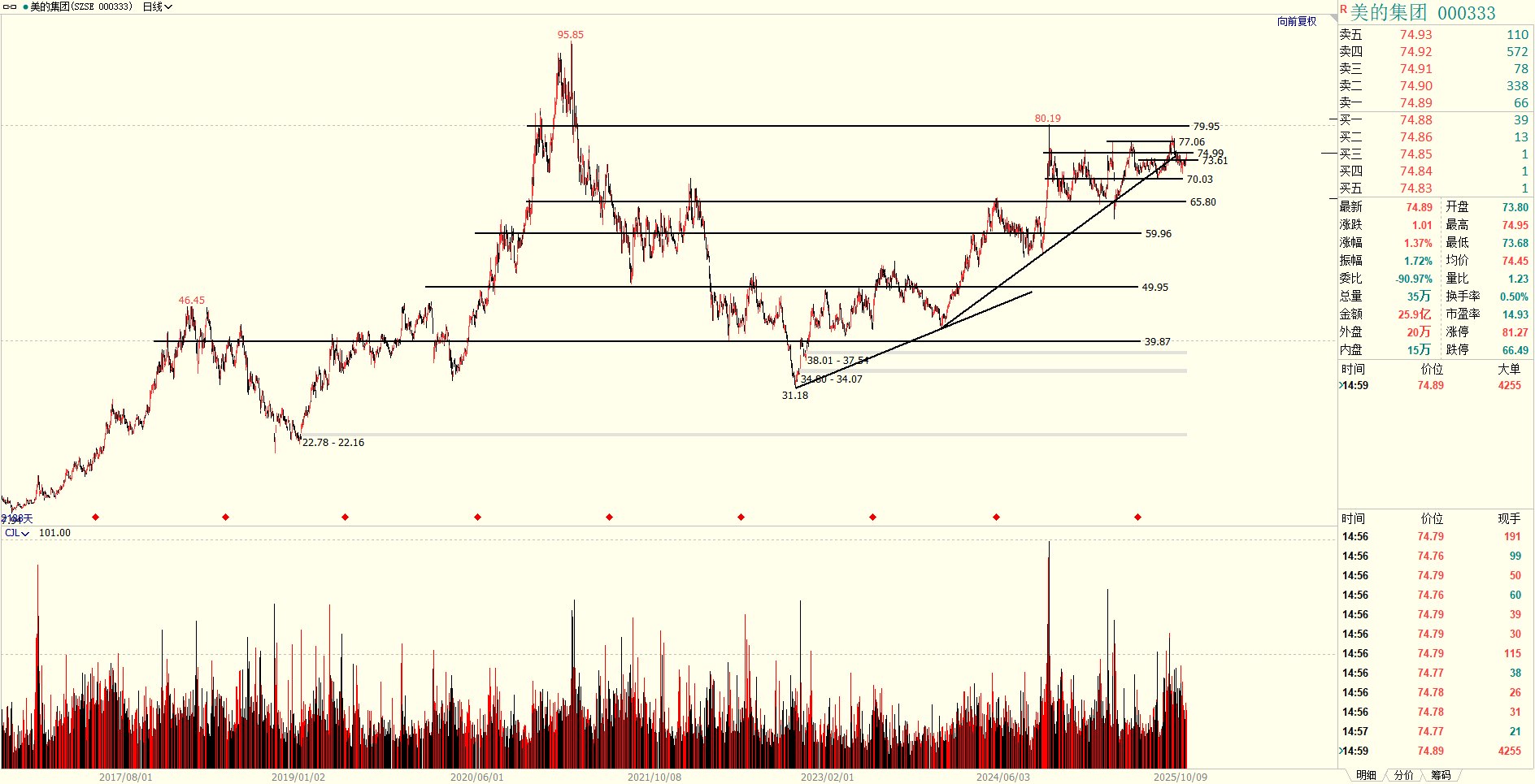 一把直尺打天下/美的集团65-75之间大规模箱体,对应主升浪目标100附近;现阶