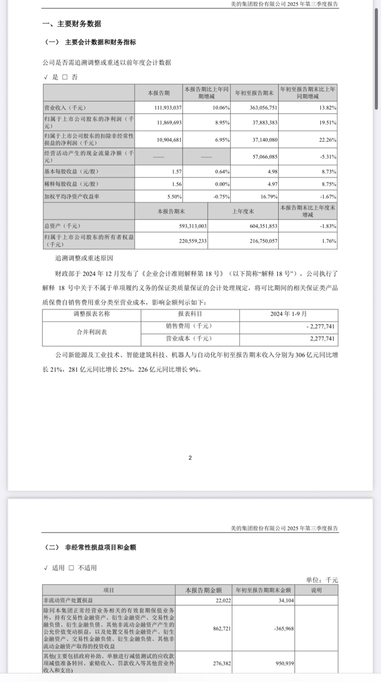 $美的集团(SZ000333)$ 2025 3季度报: 营收3630亿,同比+13.82,归母净利润378.8亿,同比+19.51%(相比2季度,净利润下降明显)