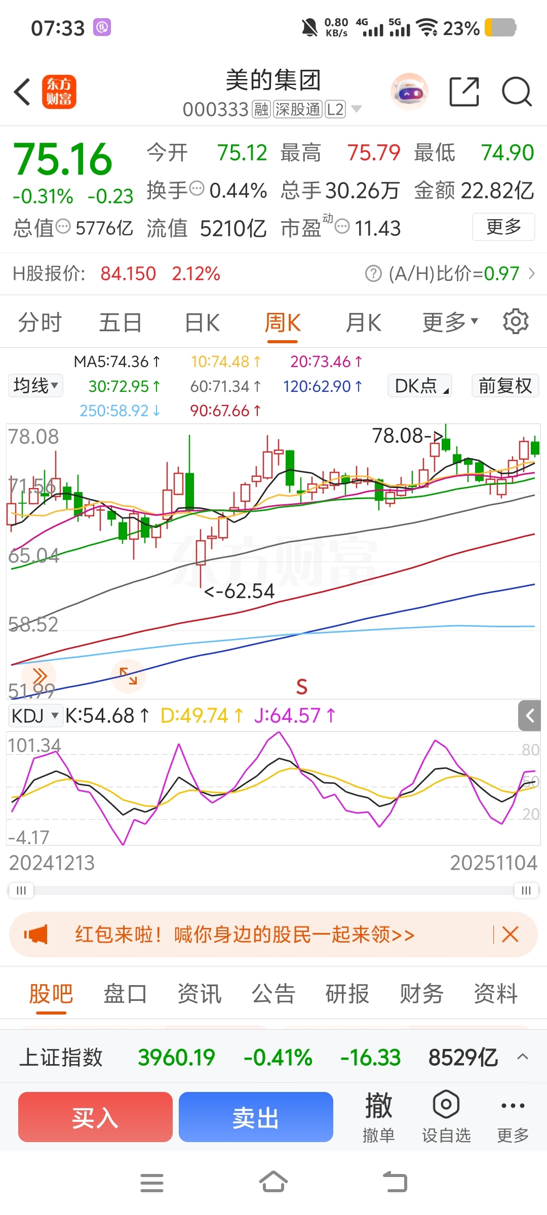 $美的集团(SZ000333)$ 这一整年走得,真稳啊,78跌到75分红,股价再跌又要回到分红前还继续跌