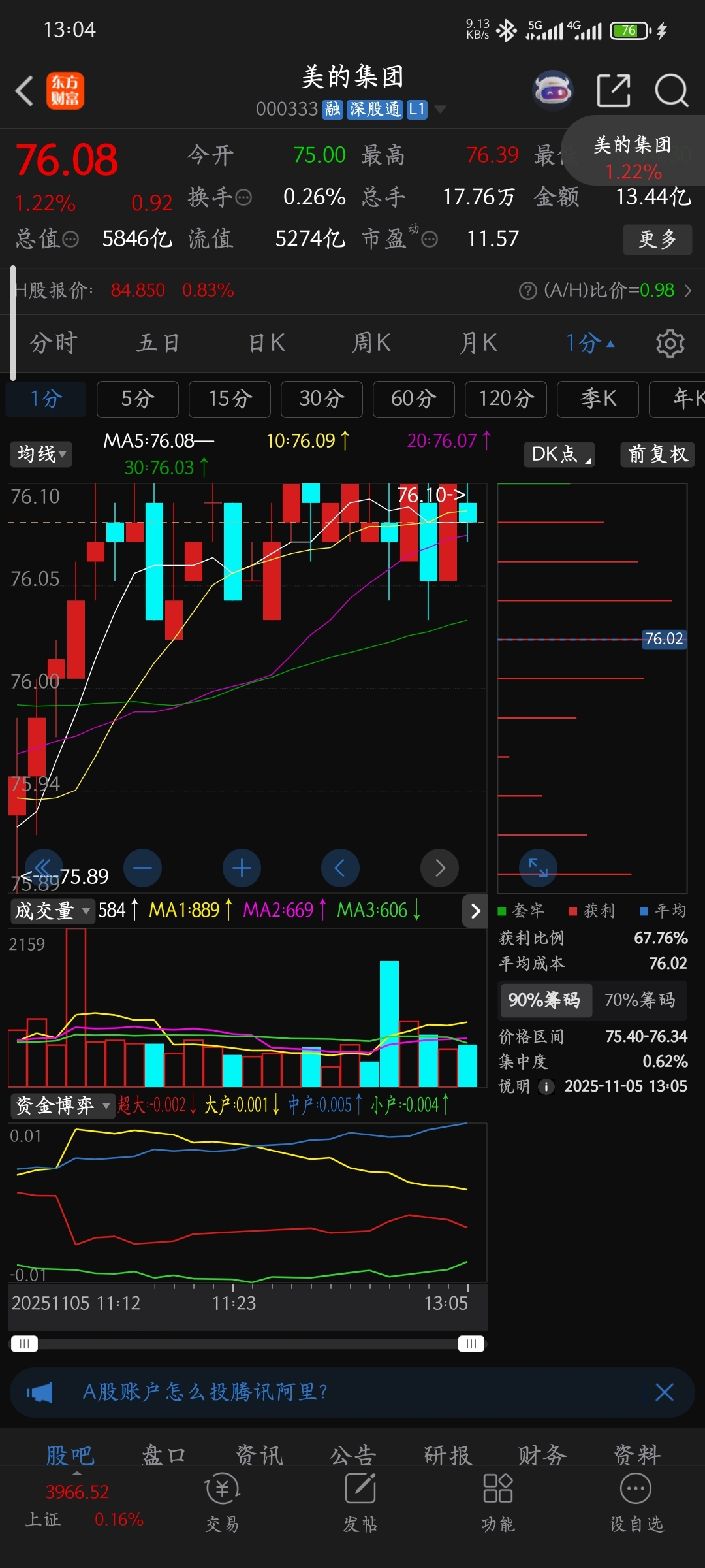 $美的集团(SZ000333)$ 控盘太牛了,76.1根本就上不去一点点