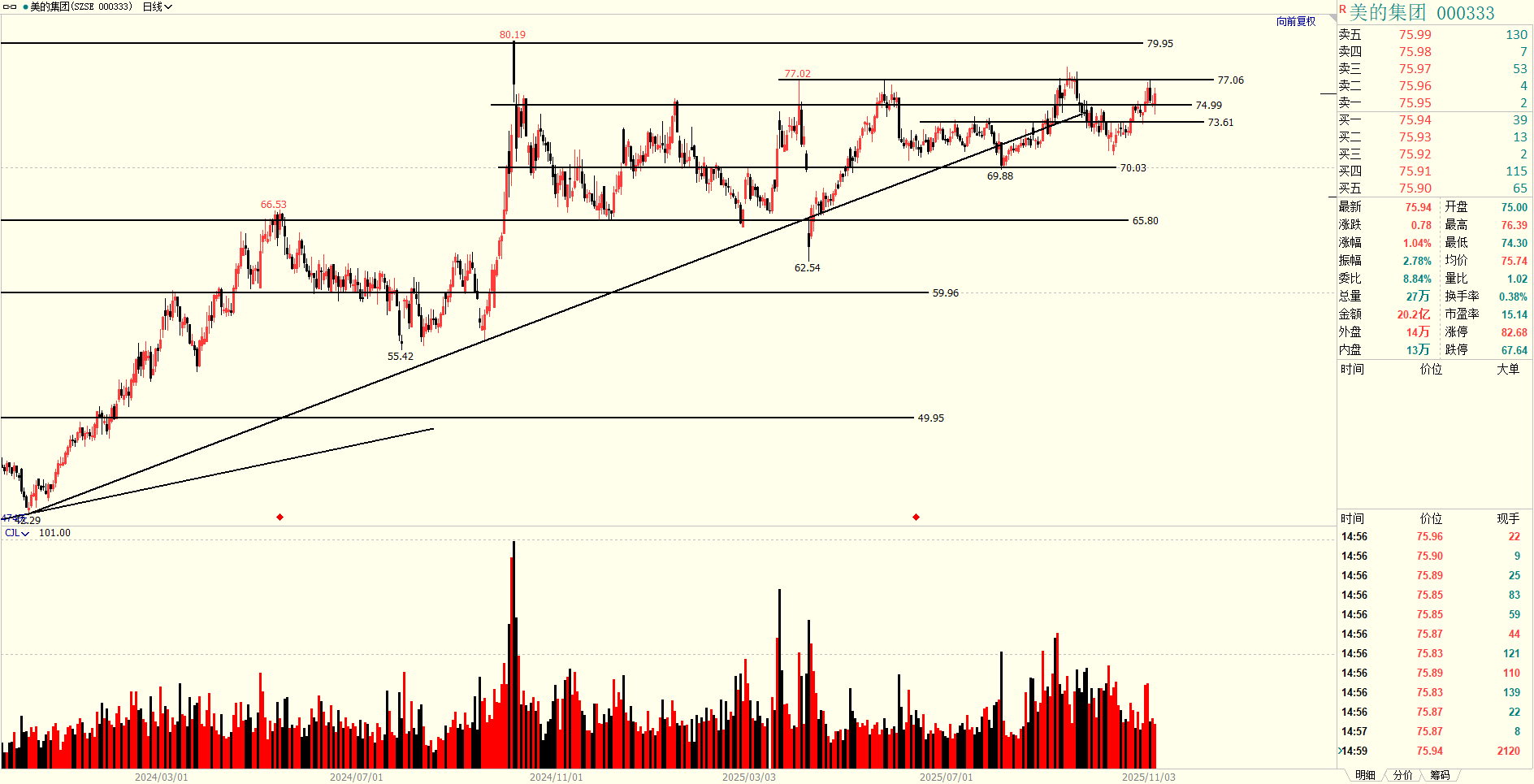 一把直尺打天下/美的集团65-75大规模箱体,主升浪目标100附近;箱体内,低点
