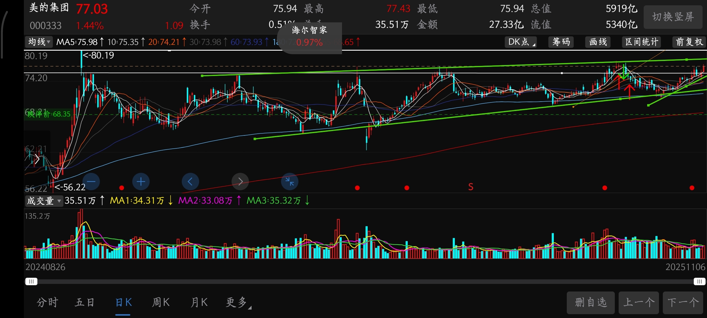 $美的集团(SZ000333)$ 箱体顶估计在78.5左右
