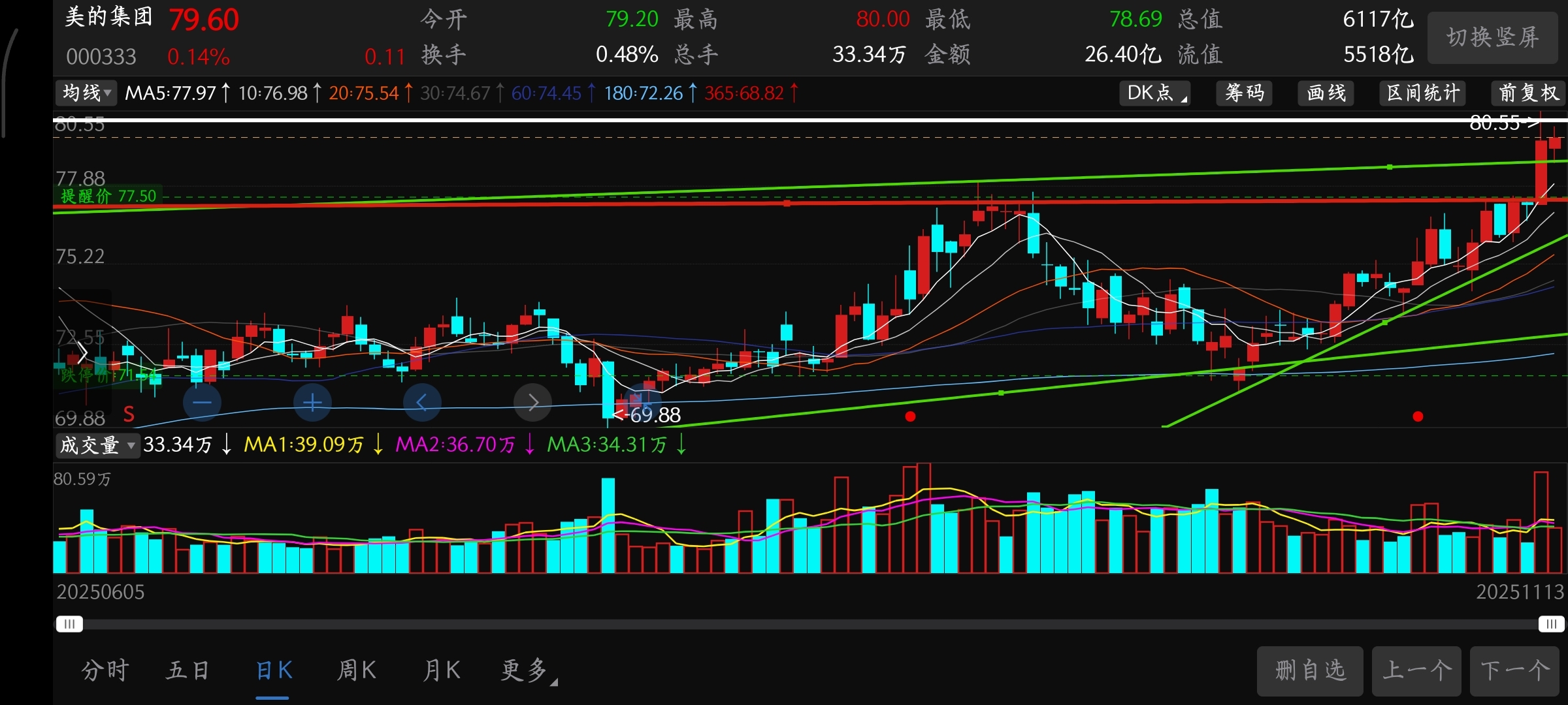 $美的集团(SZ000333)$ 继续持股待涨,5日均线减仓,77止损