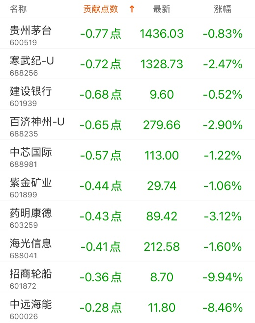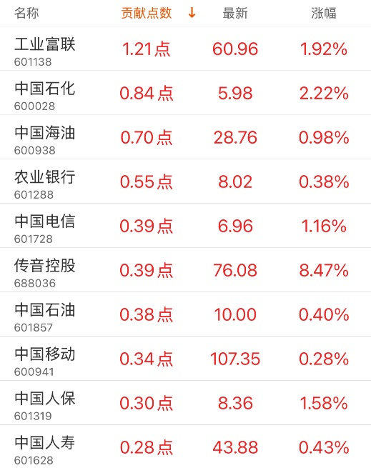 对上证指数贡献点数最多的个股是工业富联,贡献1.21点,该股当日涨1.92%,收盘价60.96元;拖累点数最多的个股是贵州茅台,拖累0.77点,该股当日跌0.83%,收盘价1436.03元。