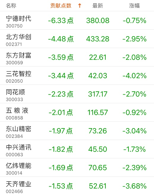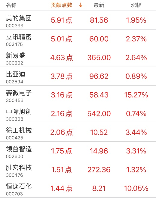对深证成指贡献点数最多的个股是美的集团,贡献5.91点,该股当日涨1.95%,收盘价81.56元;拖累点数最多的个股是宁德时代,拖累6.33点,该股当日跌0.75%,收盘价380.08元。