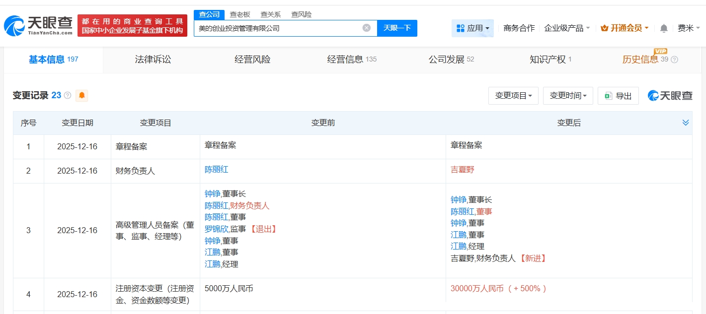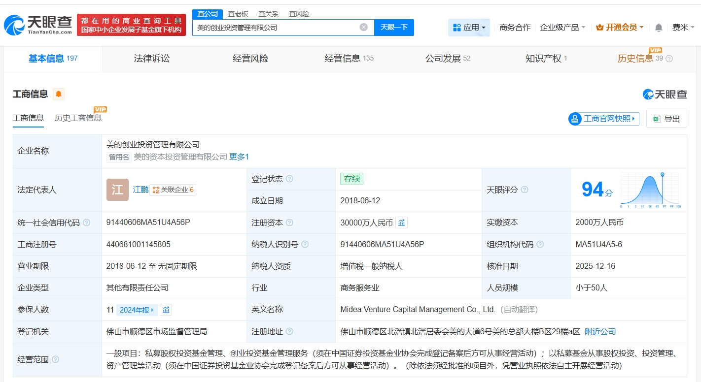 每经AI快讯,天眼查App显示,近日,美的创业投资管理有限公司发生工商变更,注册资本由5000万元人民币增至3亿元人民币,增幅500%,同时,部分高管发生变更。该公司成立于2018年6月,法定代表人为江鹏,经营范围为私募股权投资基金管理、创业投资基金管理服务,以私募基金从事股权投资、投资管理、资产管理等活动,由美的集团(000333)及旗下佛山市美的空调工业投资有限公司共同持股。