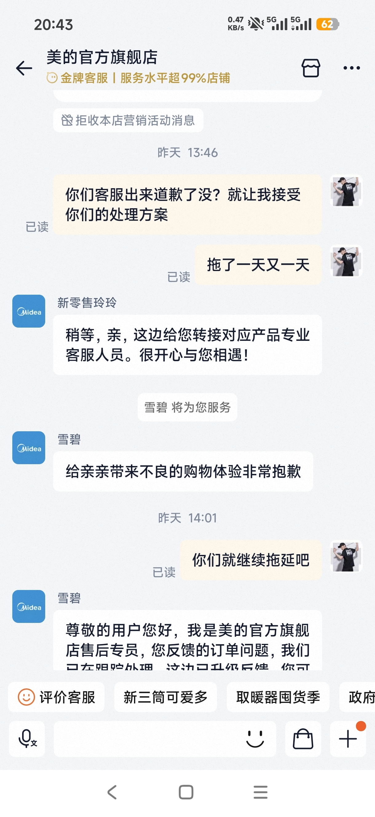 美的售后客服态度恶劣,拖延着售后,毫无诚心解决问题的态度。仅仅要求态度恶劣的客服