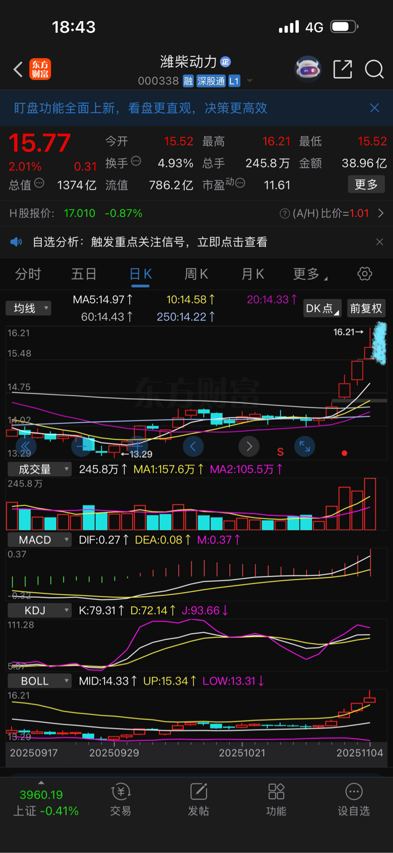 $潍柴动力(SZ000338)$ 明天走势,早盘高开,最多5分钟后一路下行,收盘跌2-3%,形成一根实体大阴线,补涨行情告一段落。