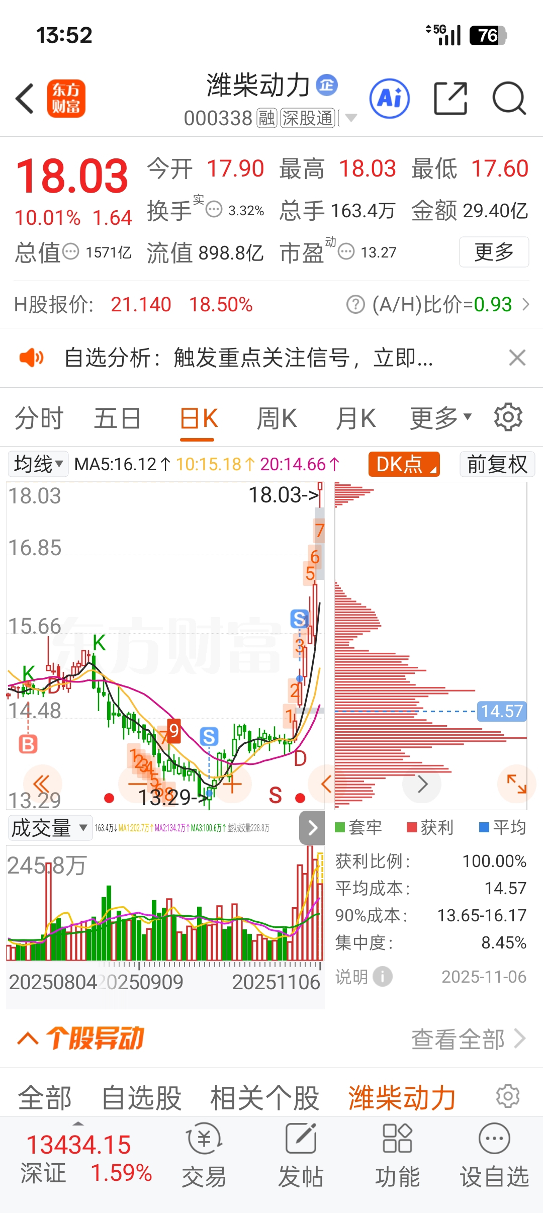 $潍柴动力(SZ000338)$ 兄弟们。我这卖点咋样,只留了一手精准卖在了最低点
