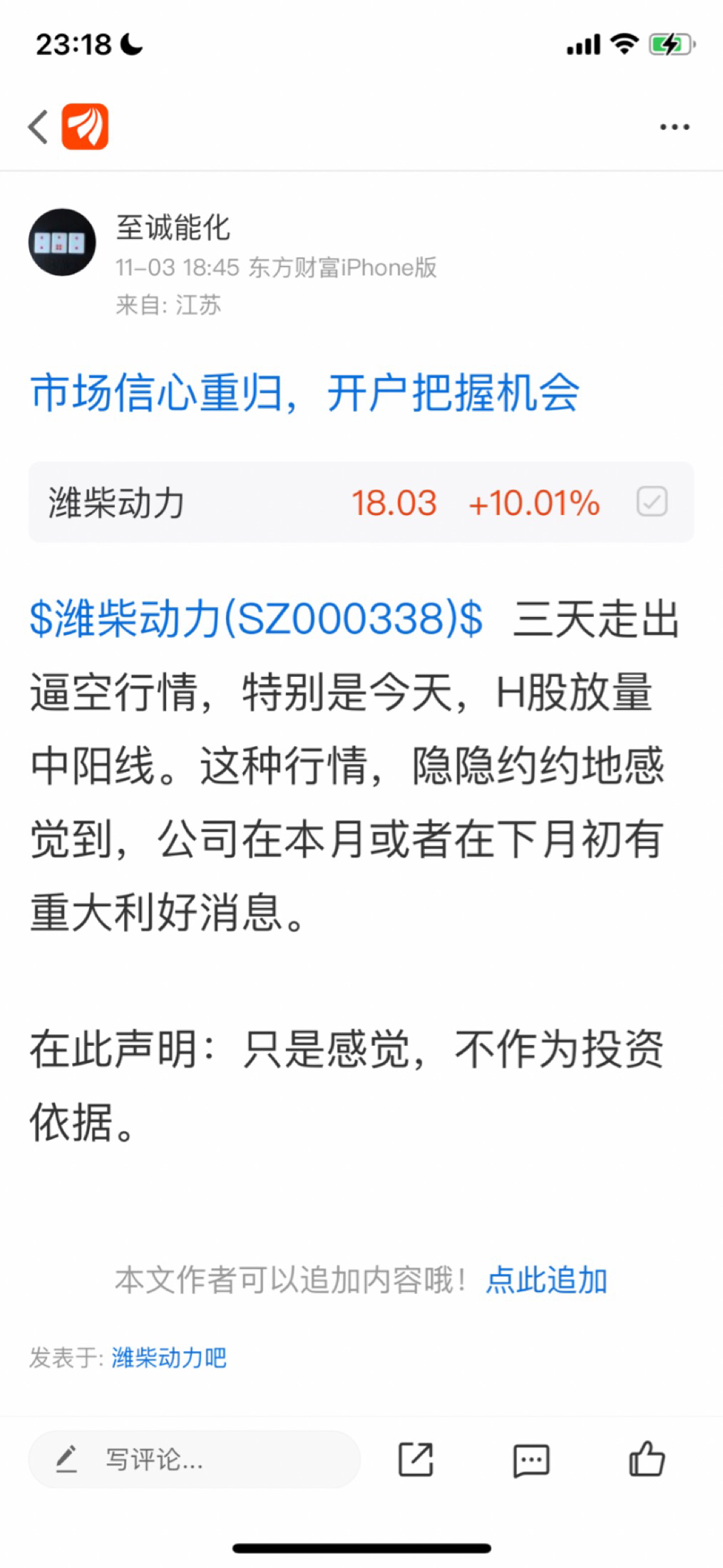 $潍柴动力(SZ000338)$ 11月3日的贴被封了。今天公司就来利好公告。