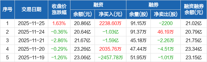 融资方面,当日融资买入1.22亿元,融资偿还9920.56万元,融资净买入2238.6万元。融券方面,融券卖出4600股,融券偿还6800股,融券余量91.15万股,融券余额1537.7万元。融资融券余额合计21.02亿元。