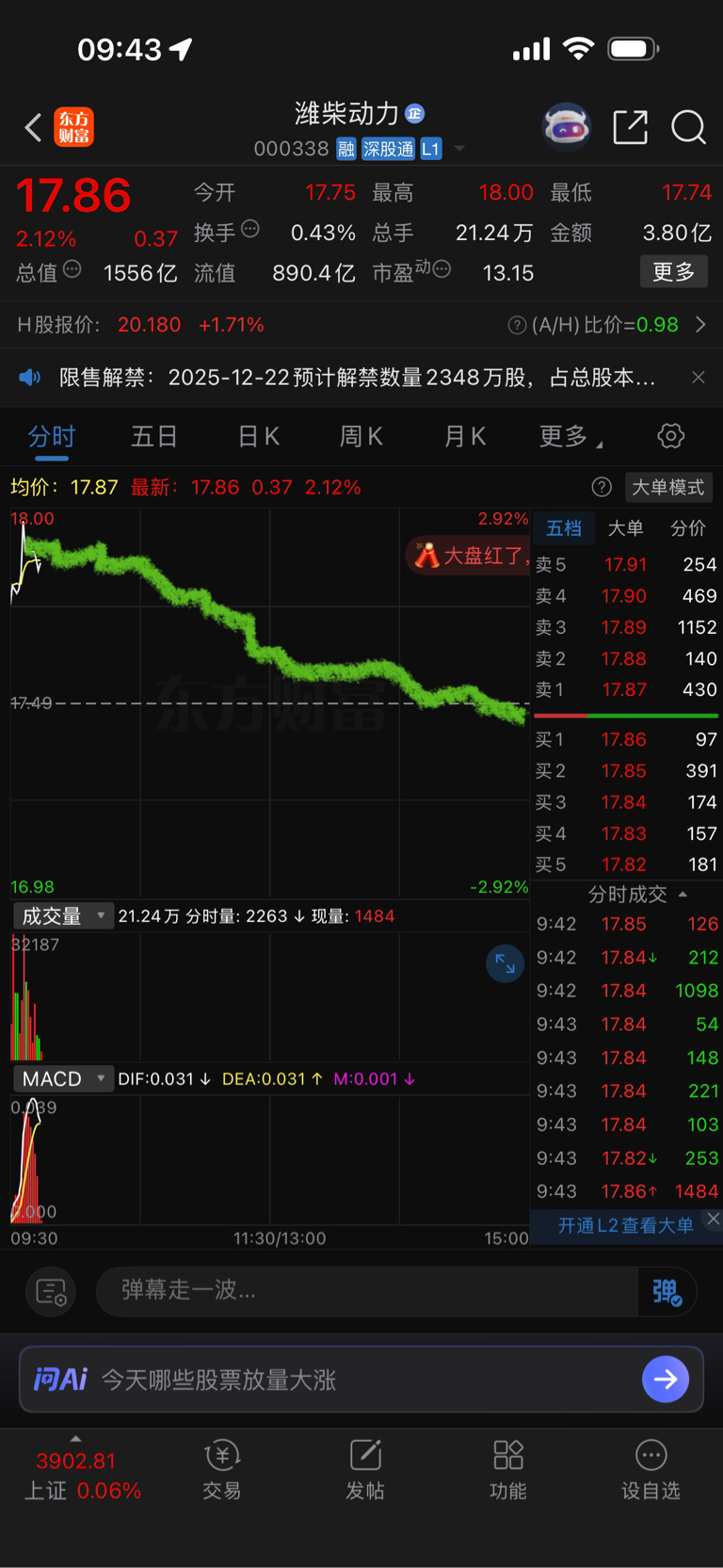 $潍柴动力(SZ000338)$ 今天的走势,卖了下午接回