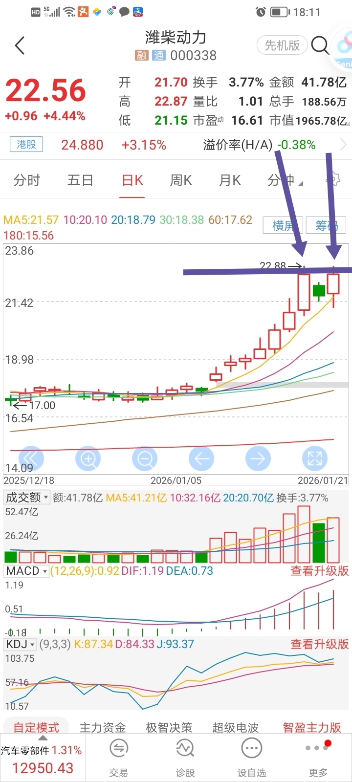 $潍柴动力(SZ000338)$ 一哥观点:周一收盘价22.55元,周三收盘价22.56元,说明什么?前天七个点减仓,躲过昨日回调,今日没有补仓,价格又回来了。把图缩小看,前期历史最高价格为23.82元。。。那么,明日会怎样??一哥也比较懵壁了。。。竟然不会分析了。。。