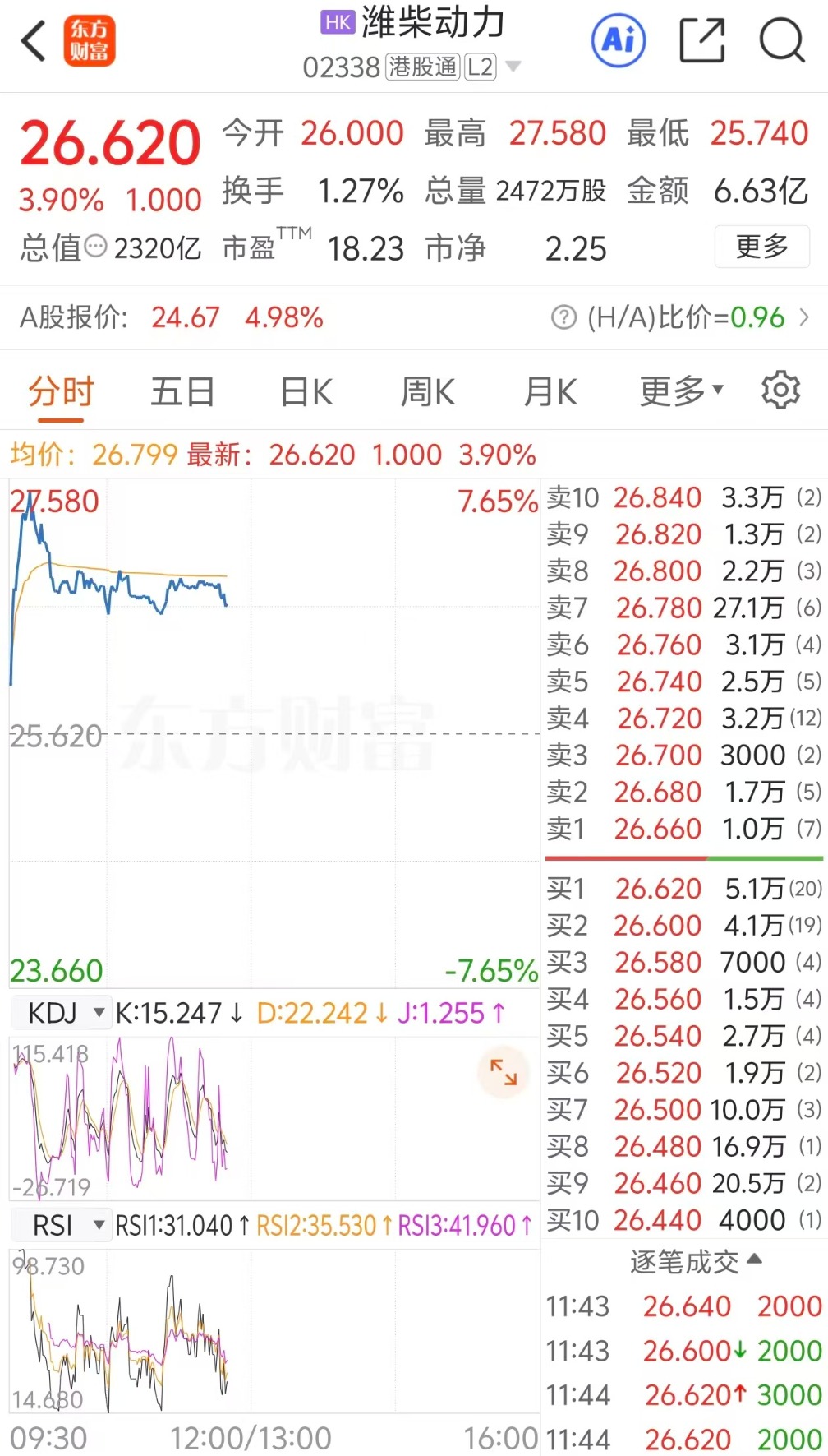 1月26日,潍柴动力H股延续近期强势表现,盘中一度涨至27.58港元/股,股价再创历史新高。截至11时44分,潍柴动力H股报26.62港元/股,涨3.9%,1月份以来该股累计涨幅已超40%。