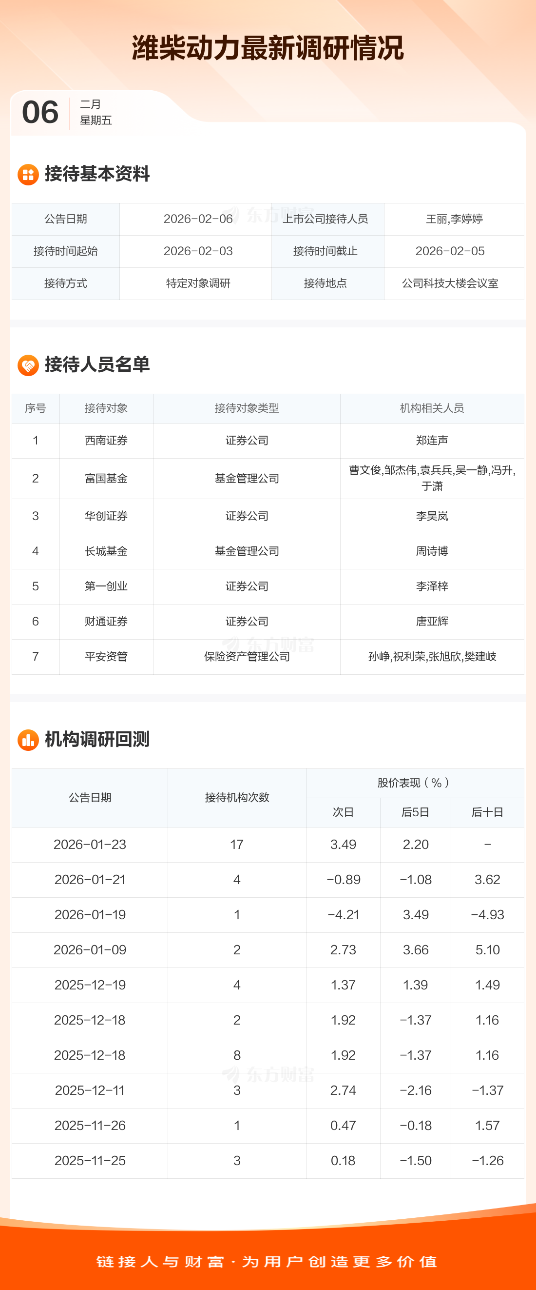 潍柴动力2月6日公告称,2月3日至2月5日接待西南证券等7家机构调研。接待人员包括王丽,李婷婷。