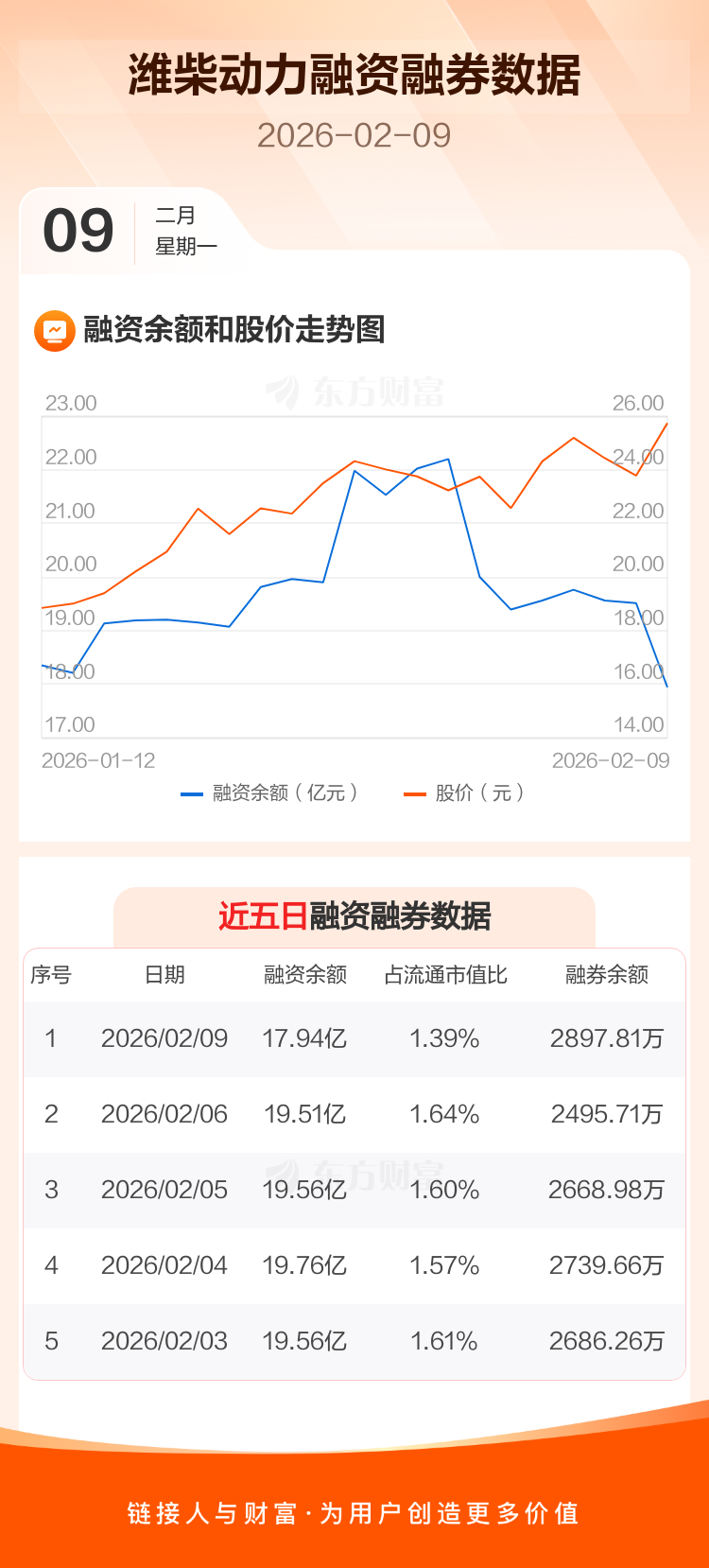 交易所最新数据显示,潍柴动力于2026年2月9日获融资买入2.38亿元,融资偿还3.95亿元,当日融资净偿还1.57亿元。目前,该股融资余额17.94亿,占流通市值比例为1.39%。