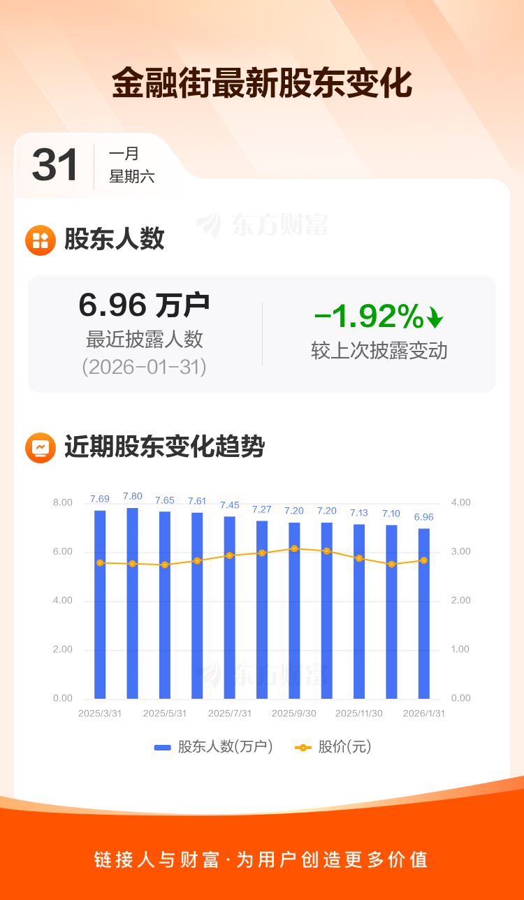 金融街最新披露数据显示,截至1月31日公司股东户数为6.96万户,较上期(2025年12月31日)减少1363户,降幅为1.92%。户均持有流通股数量由上期的4.21万股上升至4.29万股,户均持股金额由上期的11.58万元增加至12.15万元。