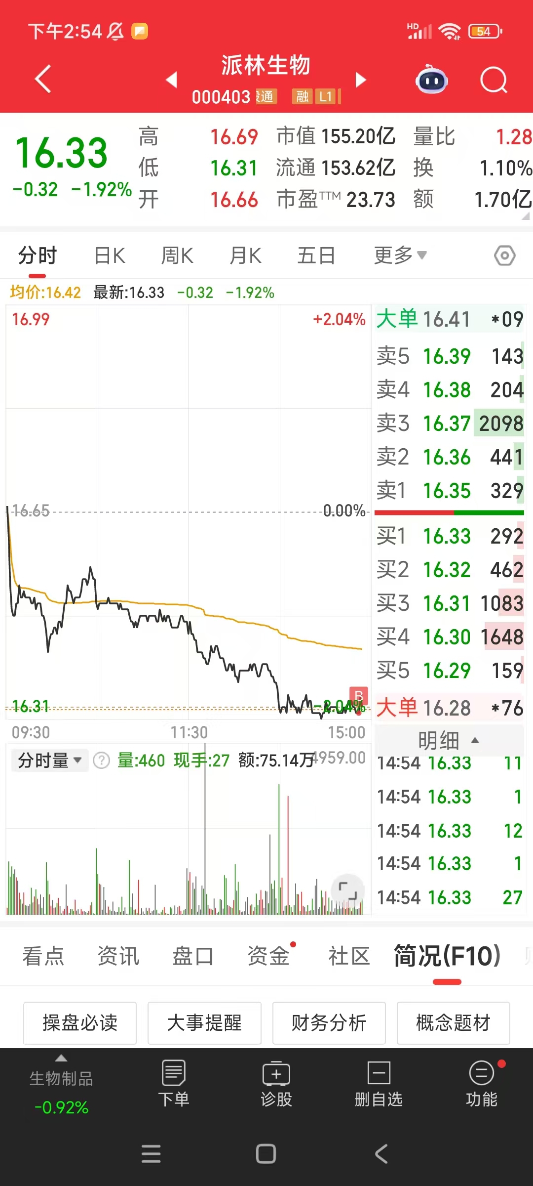 $派林生物(SZ000403)$ 16.32轻仓抄底