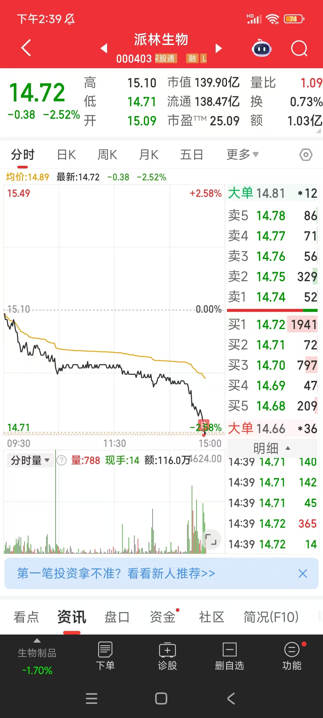 $派林生物(SZ000403)$ 14.71买了1/4仓位,本来想等14.52,没忍住开仓了