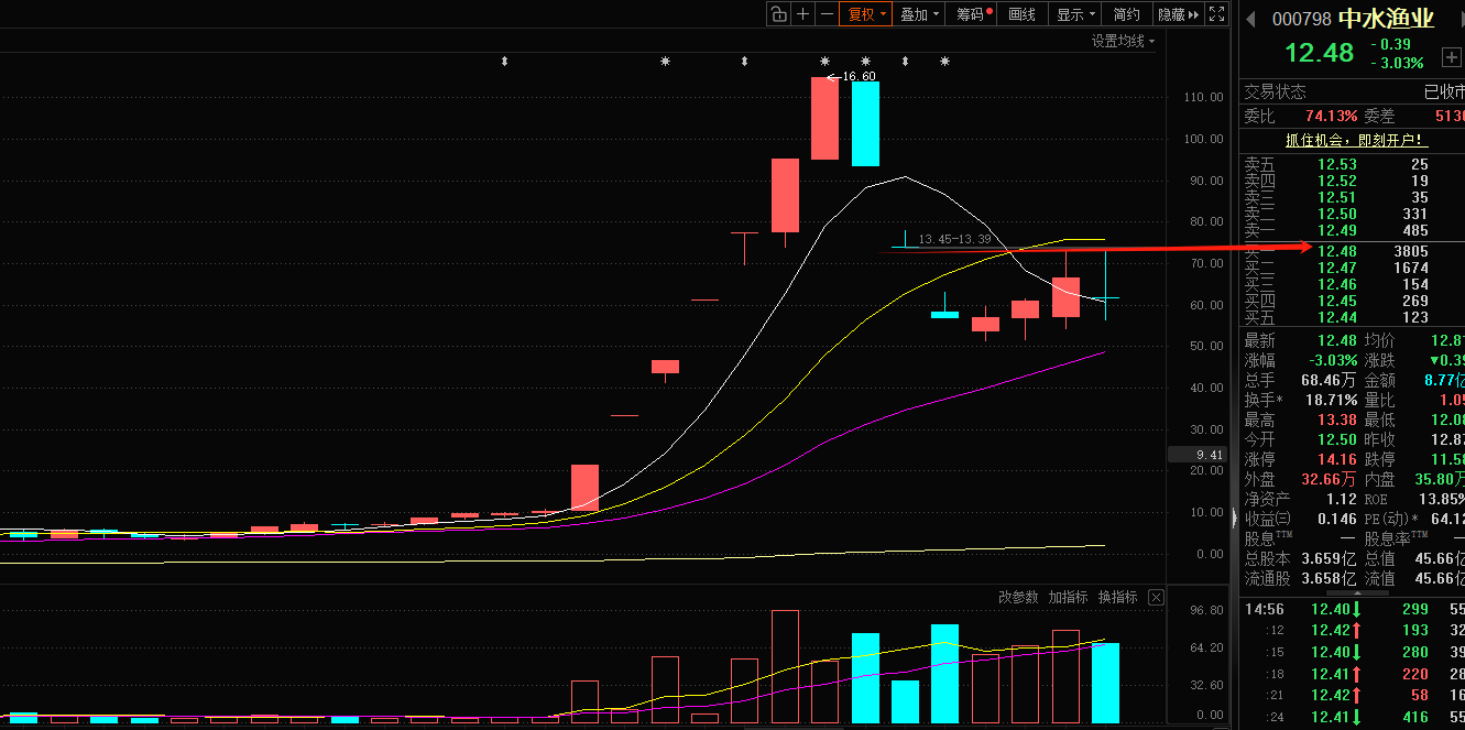 中水渔业000798:海洋经济,这里由于还没有脱离间馆期,所以短期很难出现板,所以今天只要有冲高就可以撤。