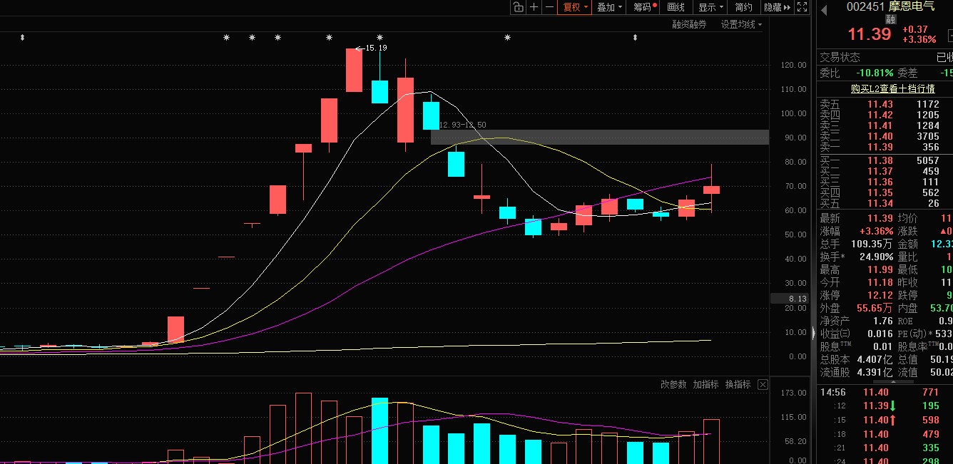 摩恩电气002451:智能电网概念,昨天几次直线的拉升几乎都要冲板了,可惜尾盘被情绪带下来了,不过今天如果能修复掉昨天的上影线的话倒还能看一天,目前主看有没有板了,没板随时撤。